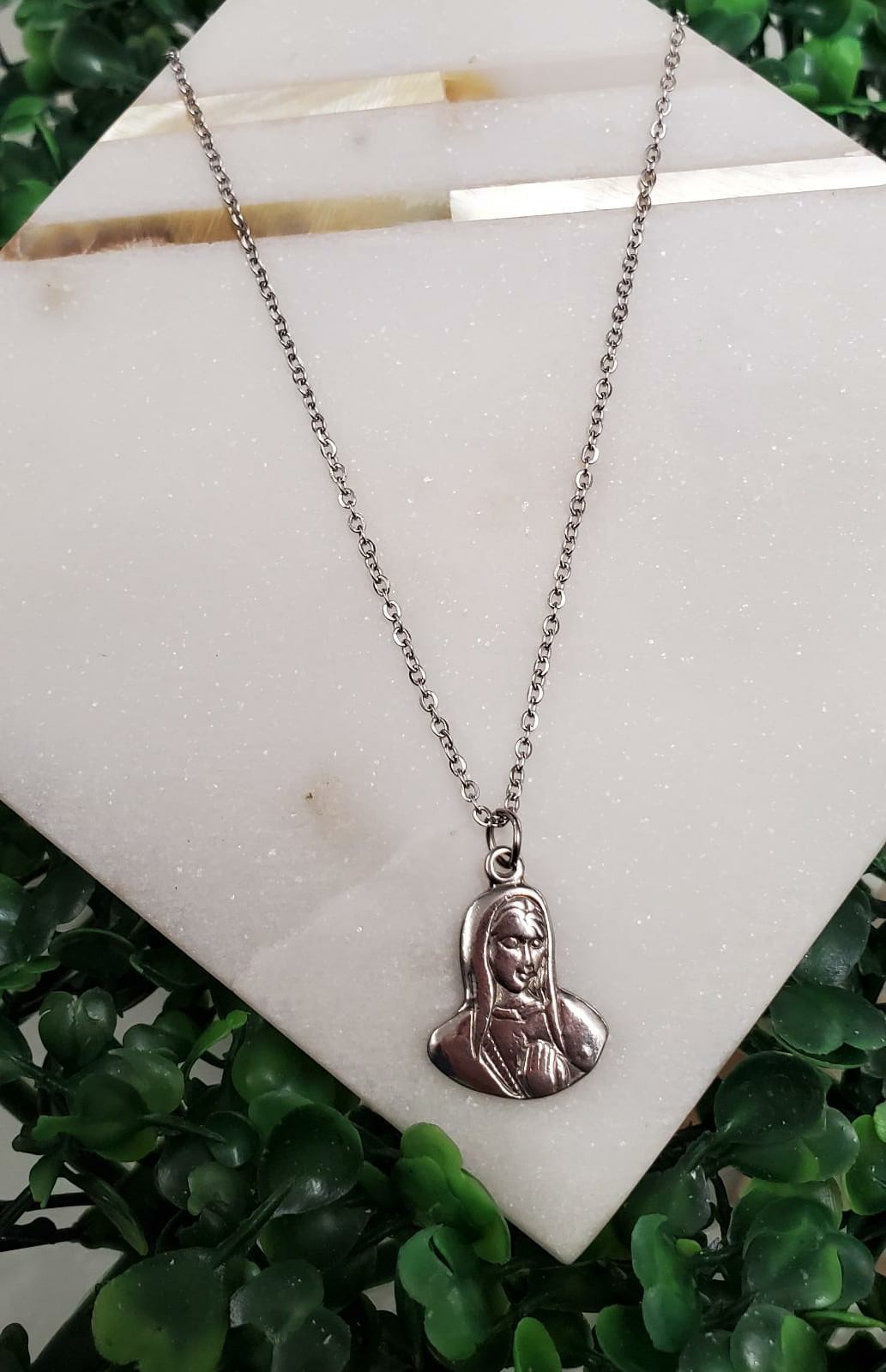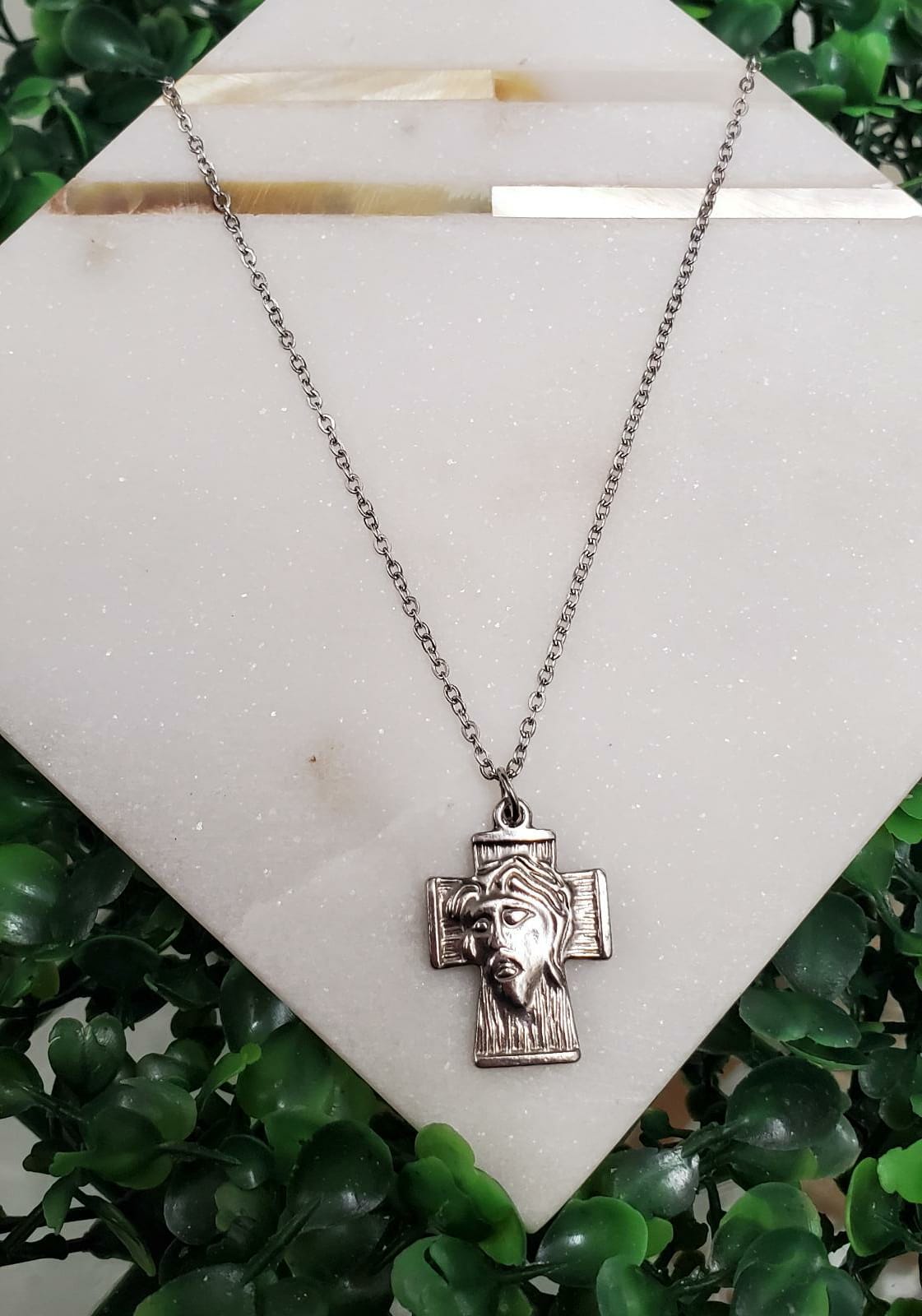 Excelente joyería que no se despinta montada a mano con diversos pendientes religiosos en plateado stainless steel. Las cadenas tienen un tamaño de 20" pulgadas de largo. Pieza mayormente utilizada como amuleto de protección. Resistentes al agua.
