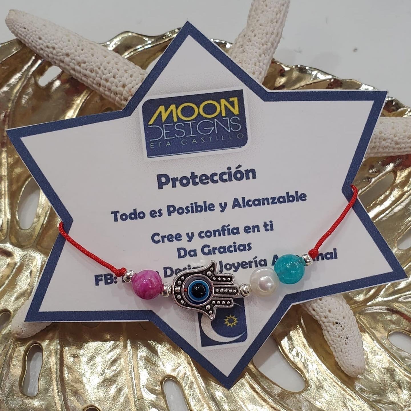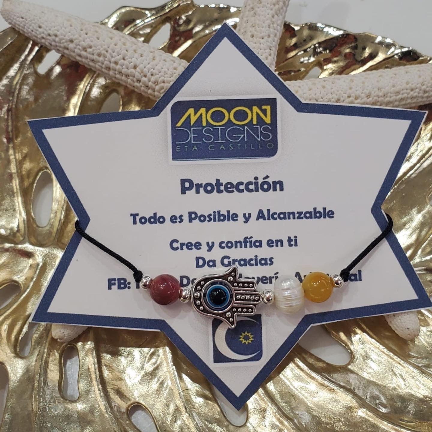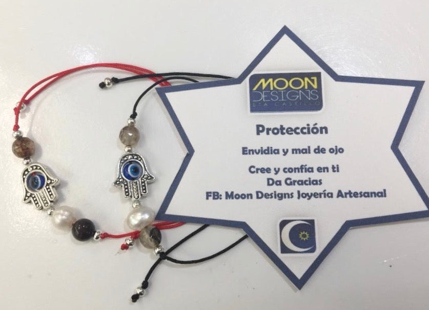Pieza confeccionada a mano con charms "Hamsa" o mano de fatima con un ojo turco en silver plated en hilo nylon ajustable. Esta prenda es muy utilizada como amuleto para la protección. Algunas de las pulseras incluyen unos detalles con piedras en ágata de diferentes colores y acompañado de una perla original cultivada de agua dulce. Resistentes al agua.