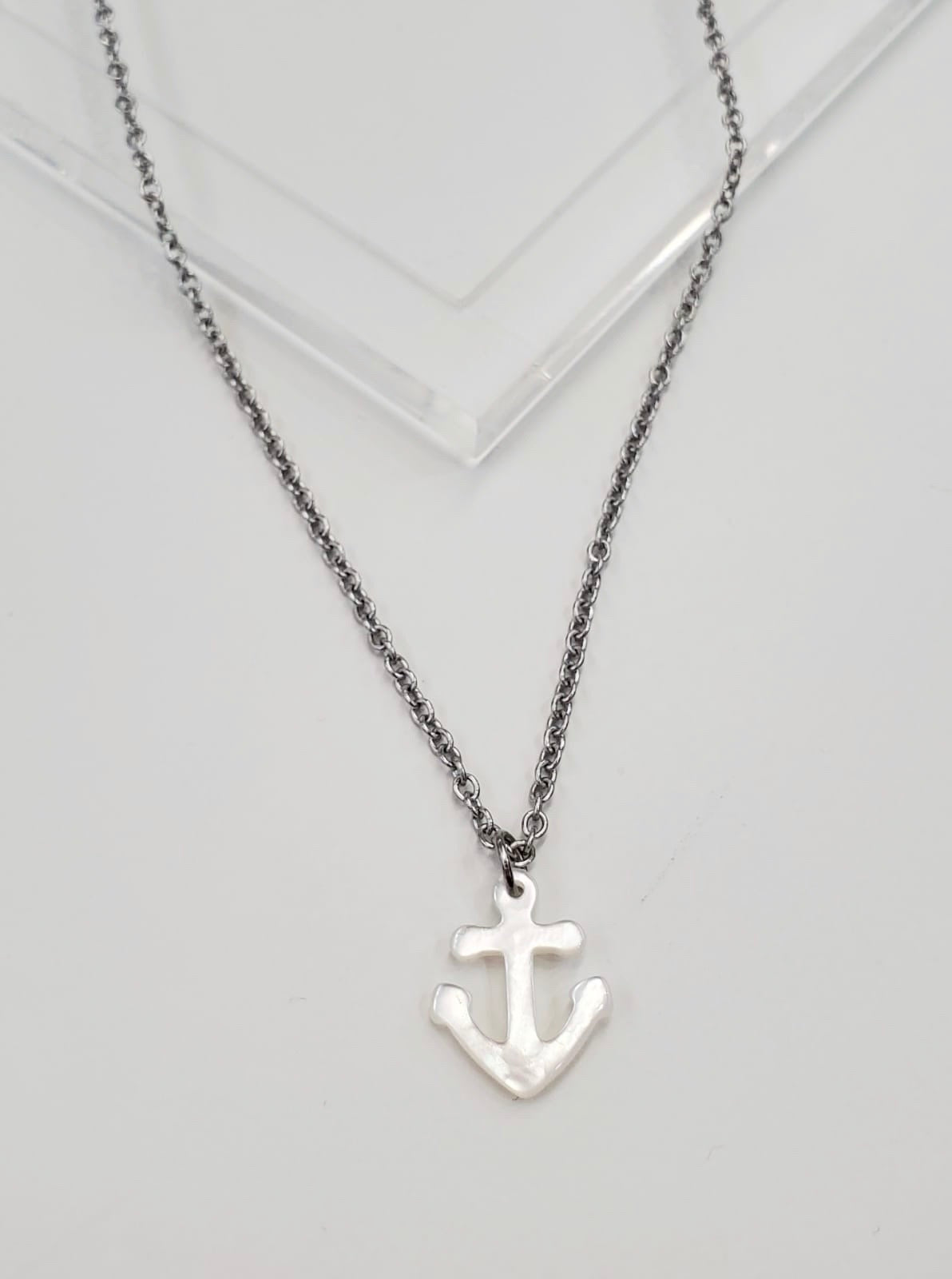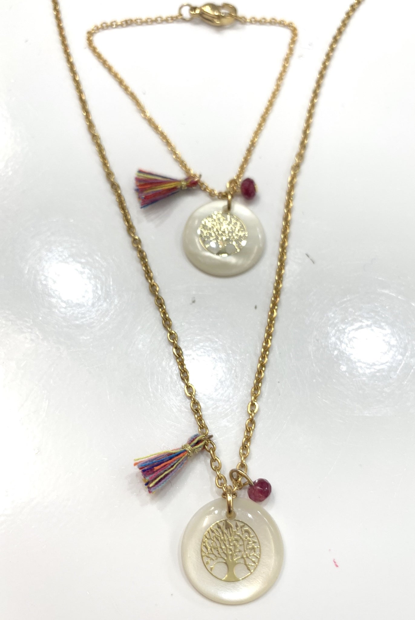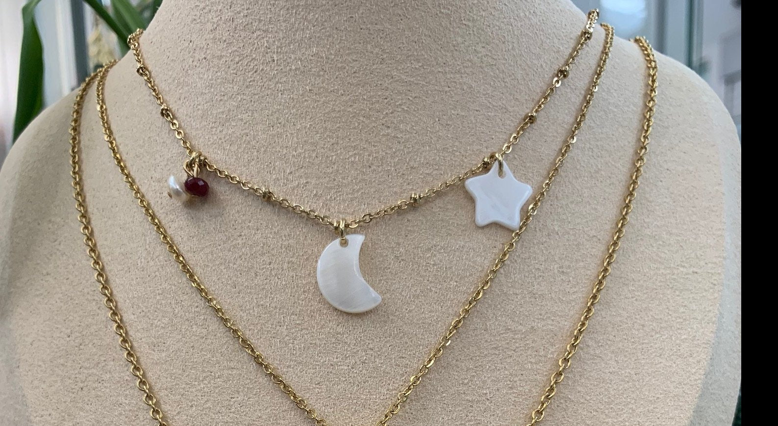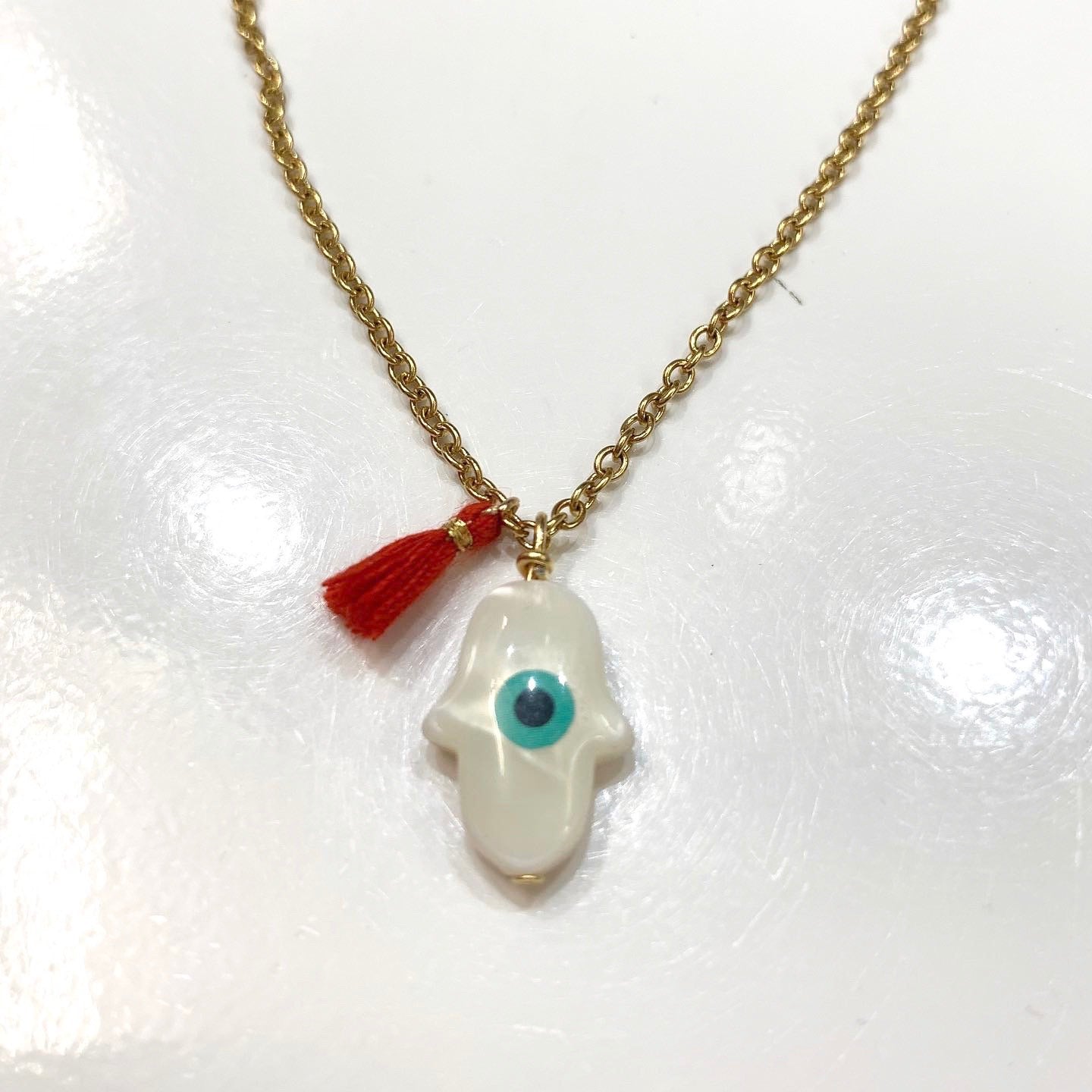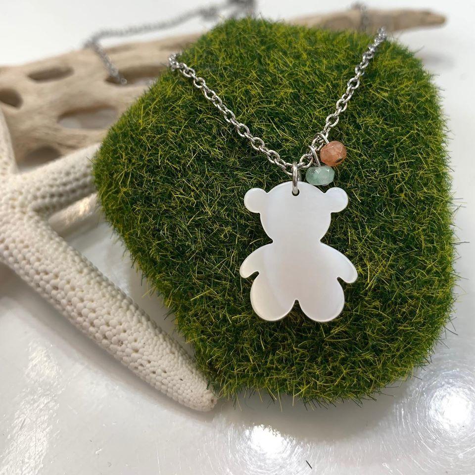 Pieza confeccionada a mano con Charms en nácar montada en una cadena de stainless steel. Excelente joyería que no se despinta y tiene un bello color perlado precioso. Algunas de las prendas incluyen unos detalles de cristales y una mini borla. La cadena tiene un tamaño de 20" pulgadas de largo. Resistentes al agua.