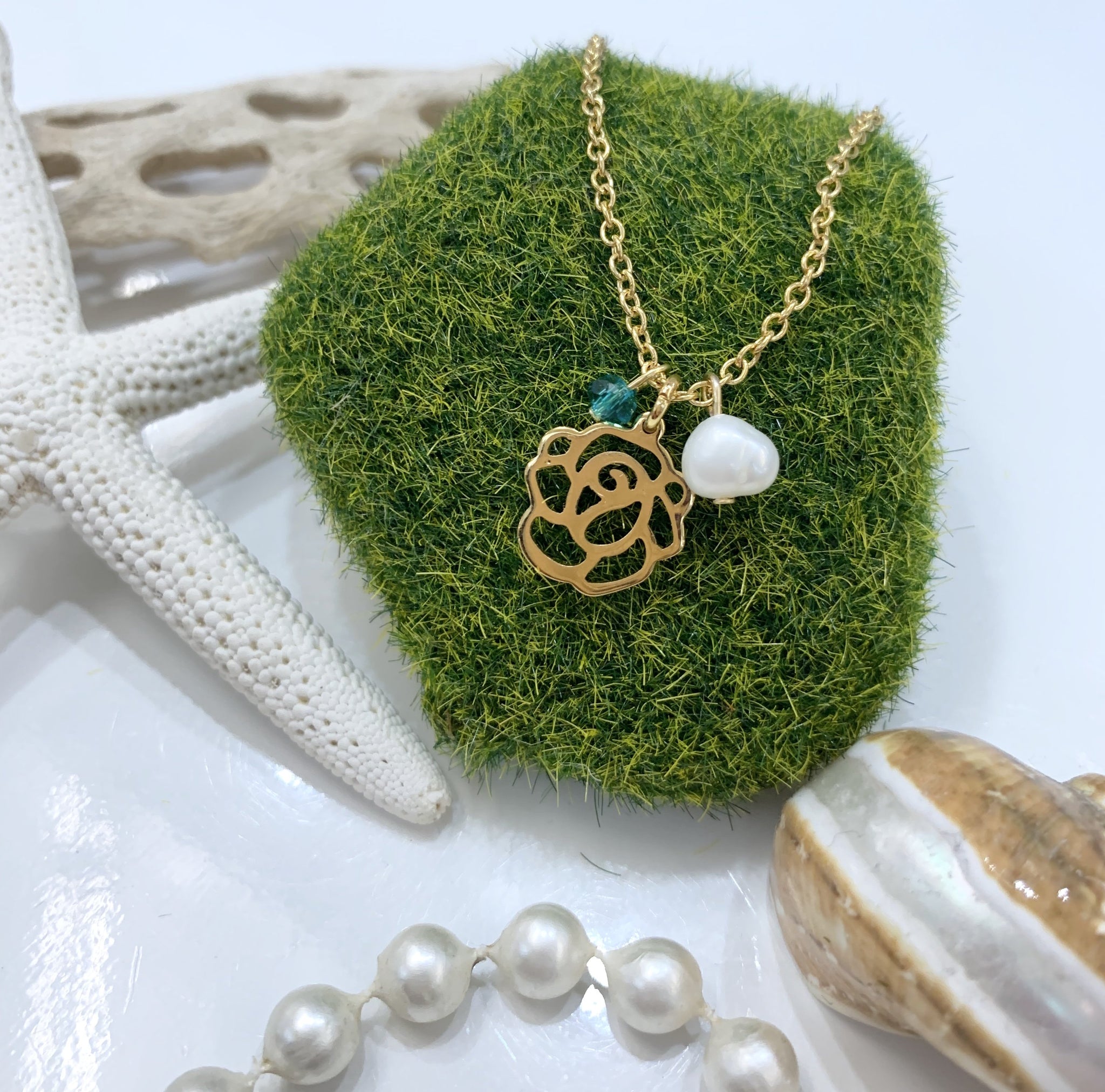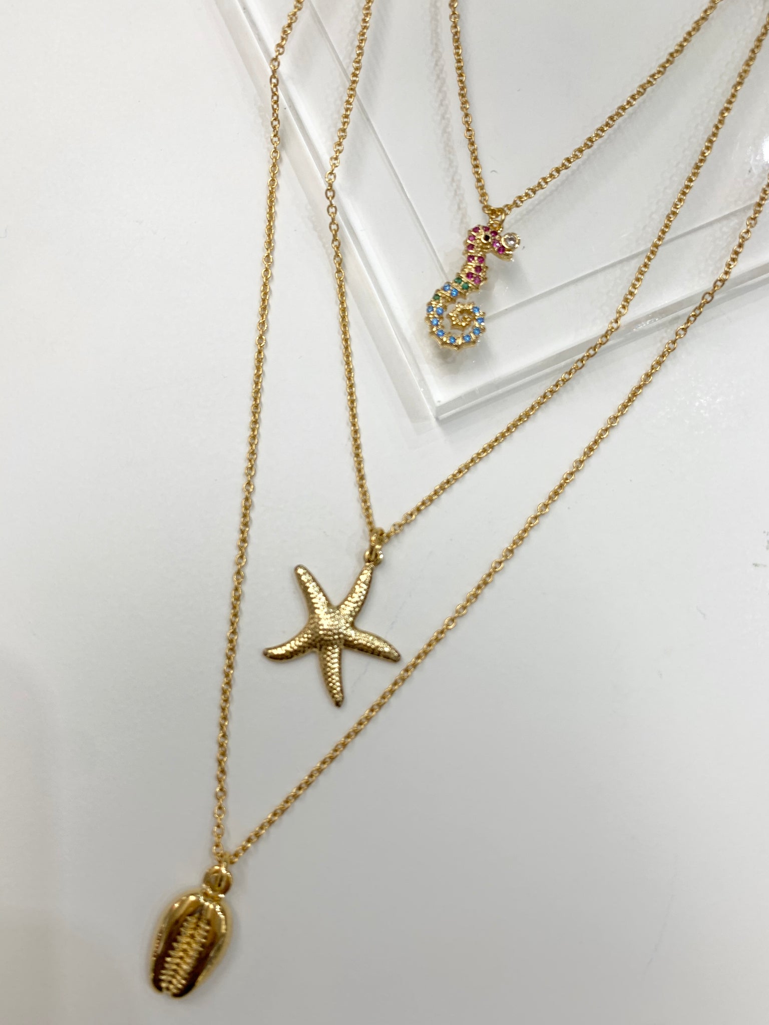 Excelente joyería que no se despinta y tiene estilos diversos al gusto. Las cadenas tiene un tamaño de 20" pulgadas de largo, son en stainless steel y los charms son goldfilled (baño en oro). Resistentes al agua. Se venden por individual. El caballito de mar tiene zirconia y perla original.