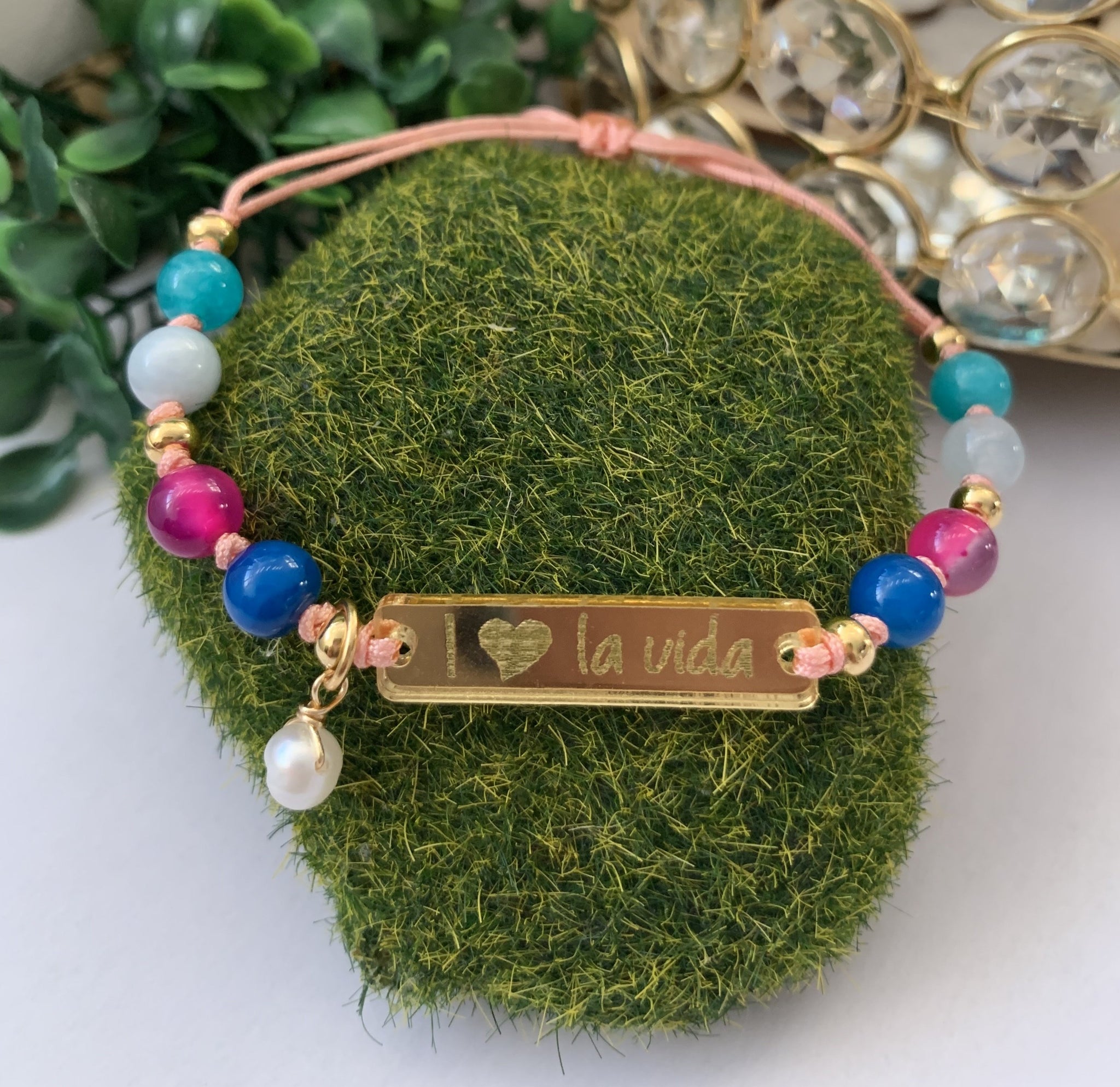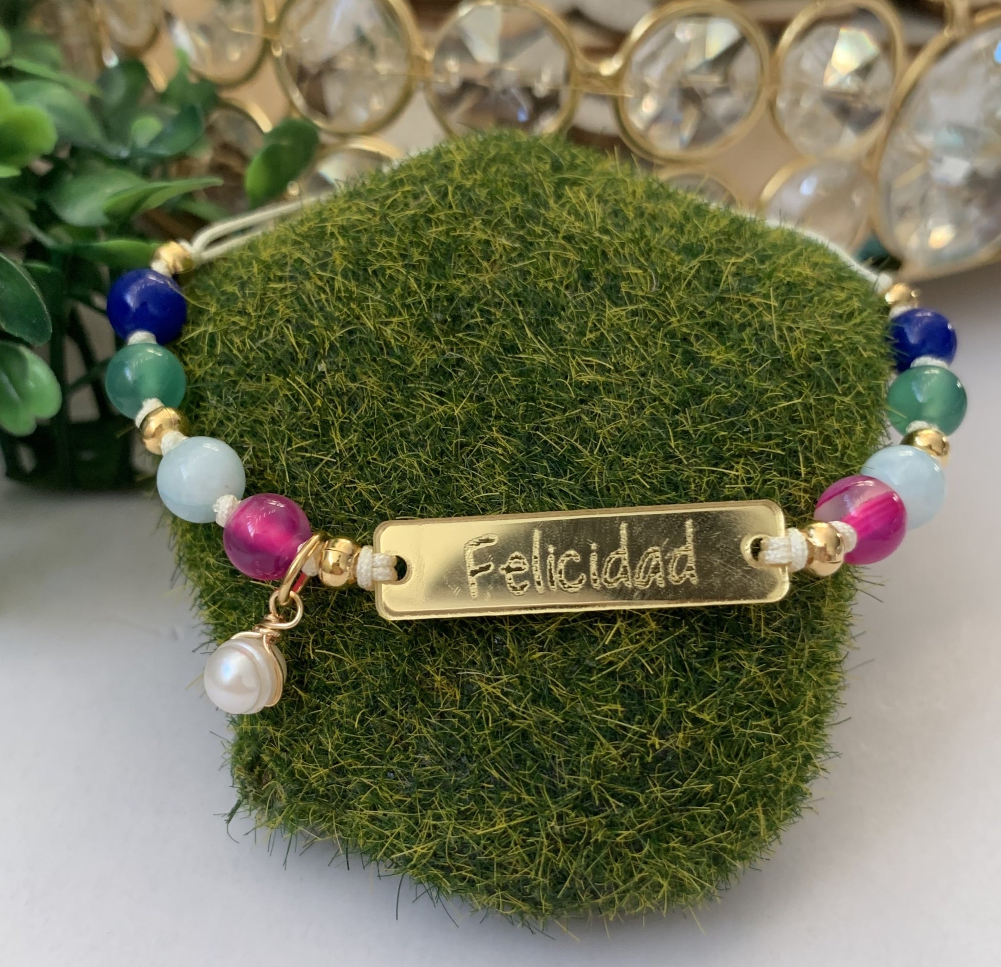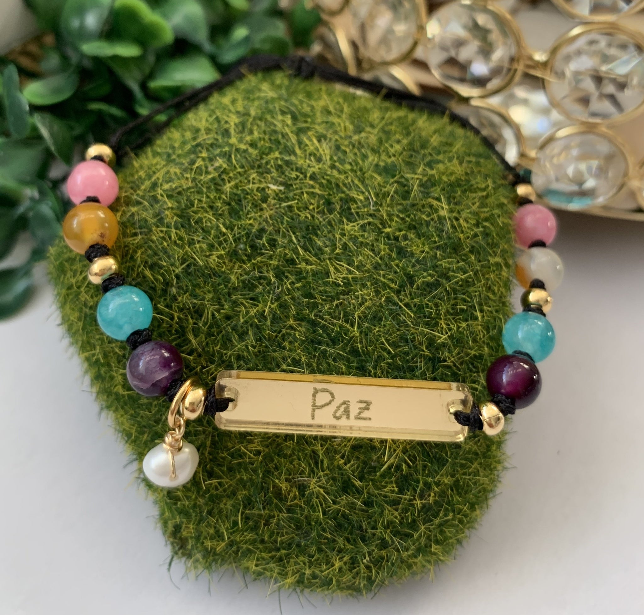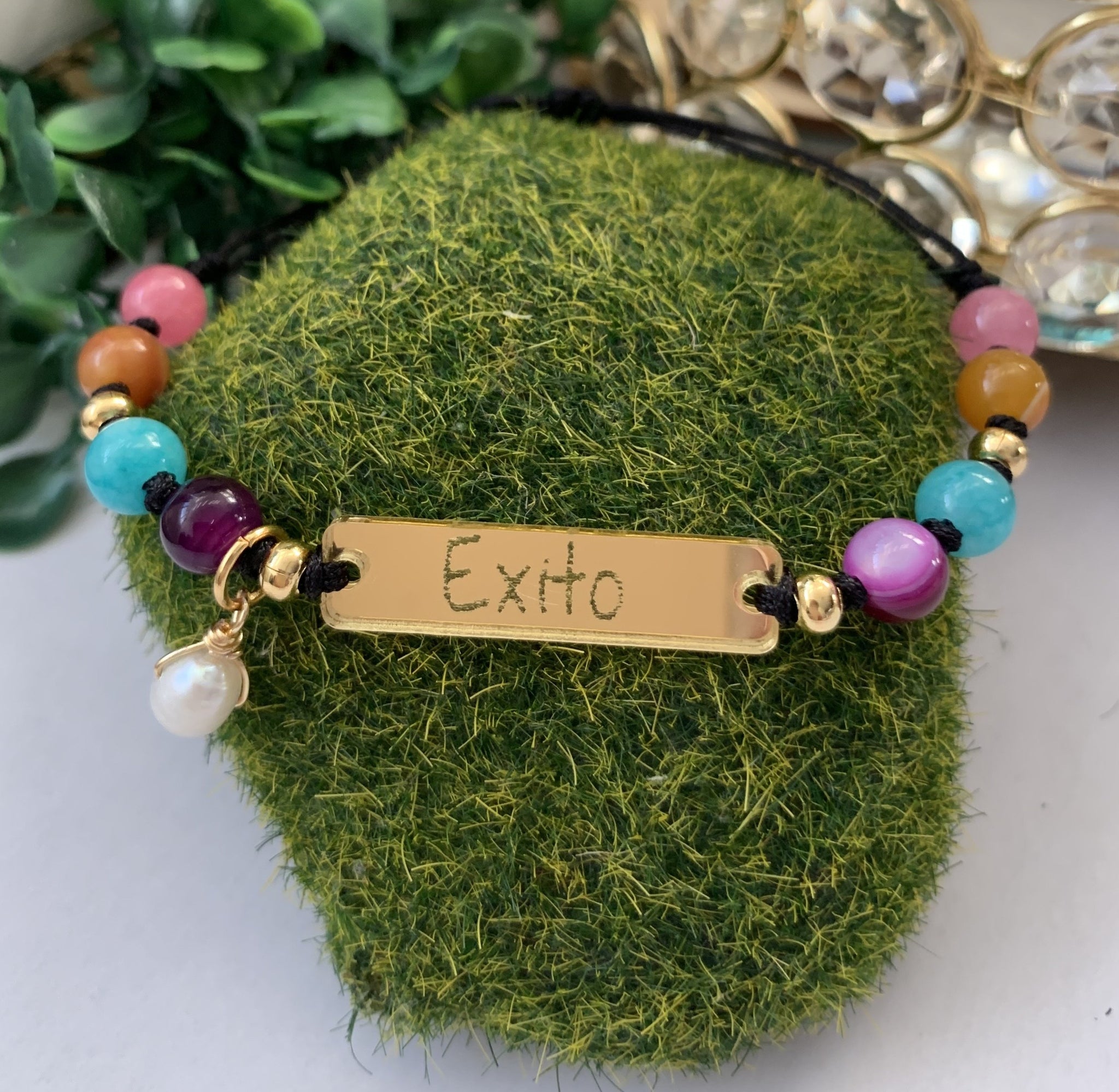 Hermosa pulseras confeccionadas a mano con una medalla de acrílico dorada espejo con diferentes grabado motivacionales, tales como: Paz, Éxito, Felicidad y