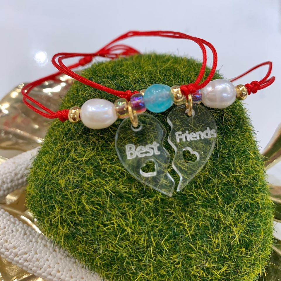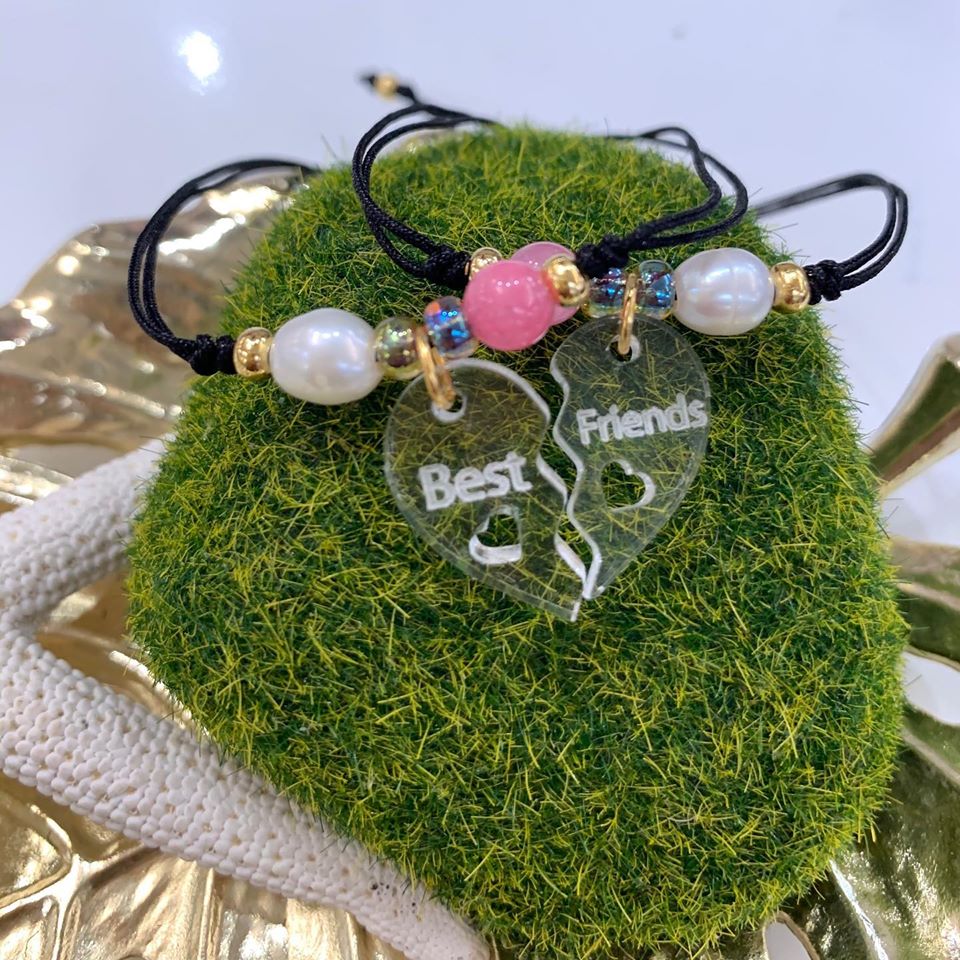 Hermoso set de 2 pulseras confeccionadas a mano con charm de acrílico en forma de corazón dividido con la palabra Best Friends y montadas en hilo de nylon ajustable. Además también incluyen una perla original de agua dulce y un cuarzo ágata. Excelente joyería para regalar a tu mejores amigos. Este set tiene un bello y único estilo para hacerlas lucir únicas y más unidas. Sus separadores plateados son en  baño en plata u oro.  Resistentes al agua.