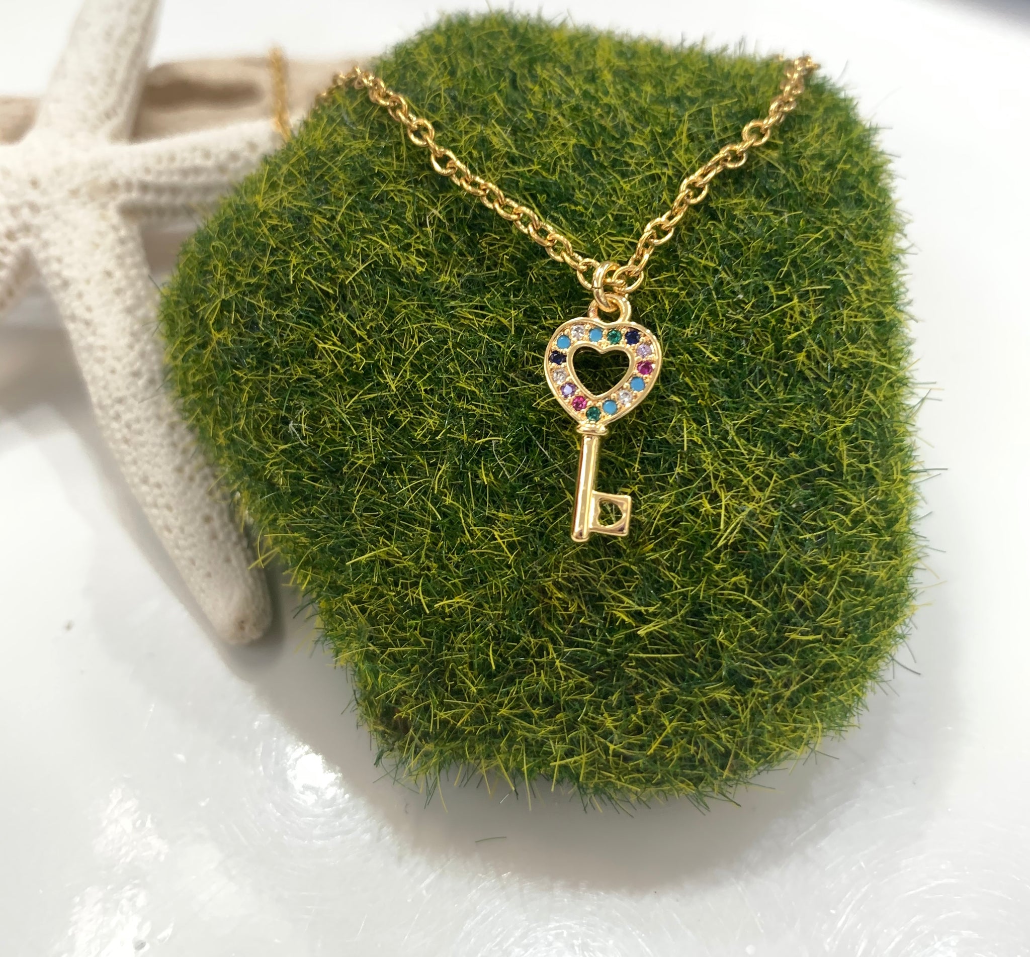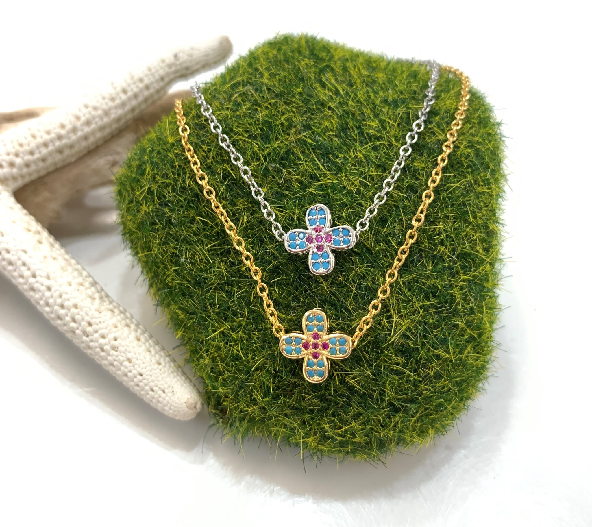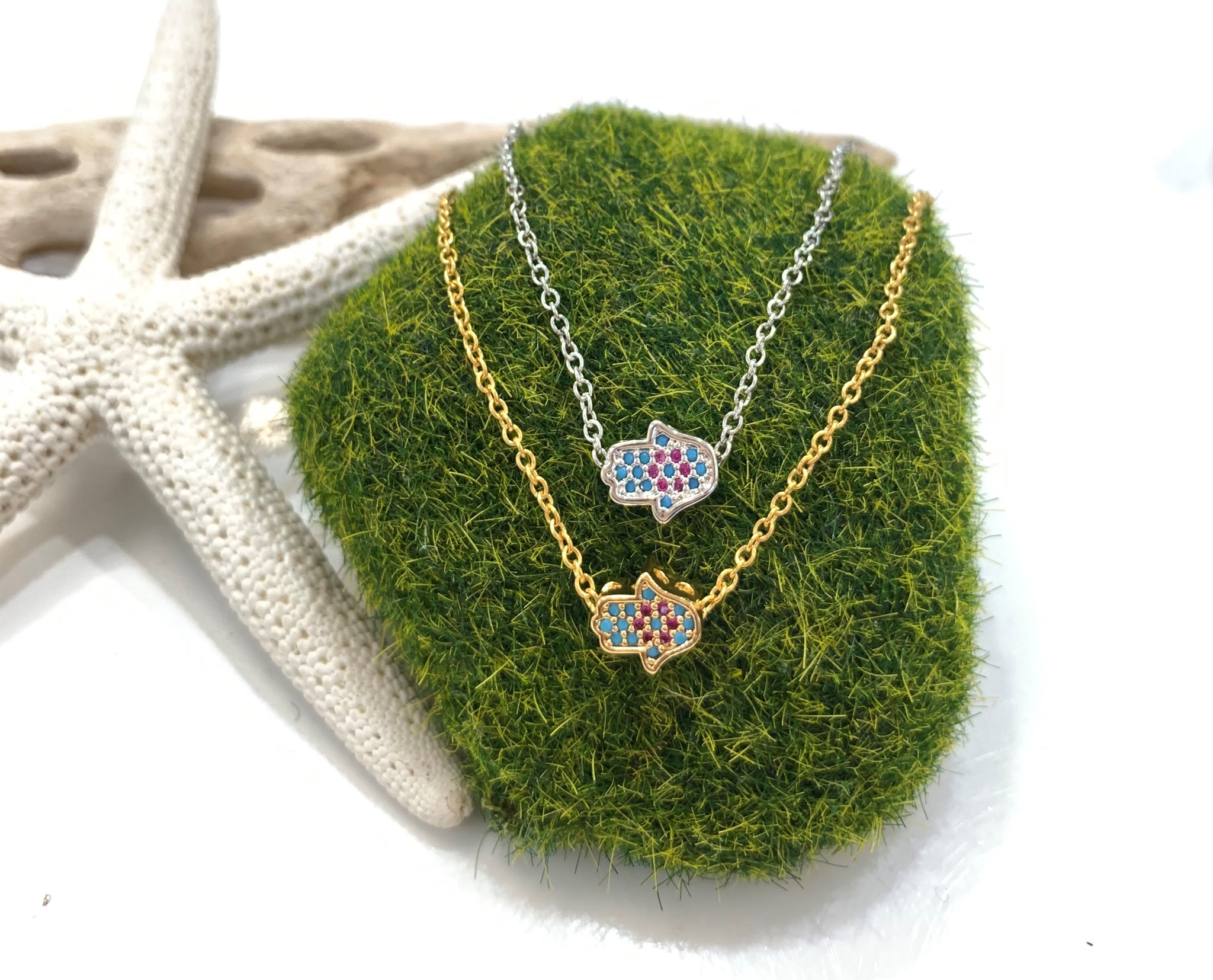 Pieza confeccionada a mano con cadena en stainless steel con diferentes charms que pueden ser utilizados como amuletos. Todos incluyen detalles en zirconia. La cadena tiene un tamaño de 20" pulgadas de largo. Resistentes al agua.