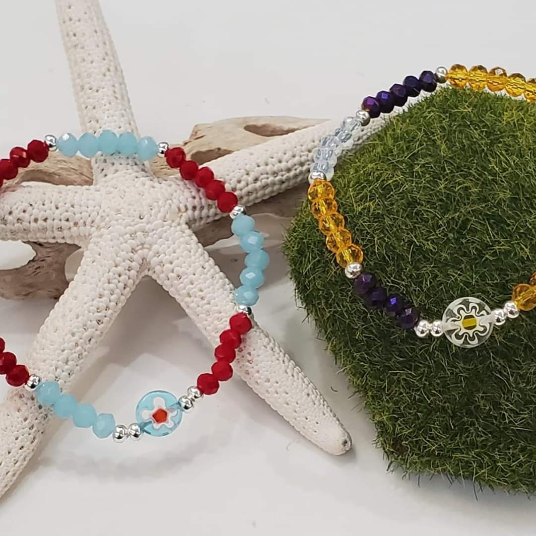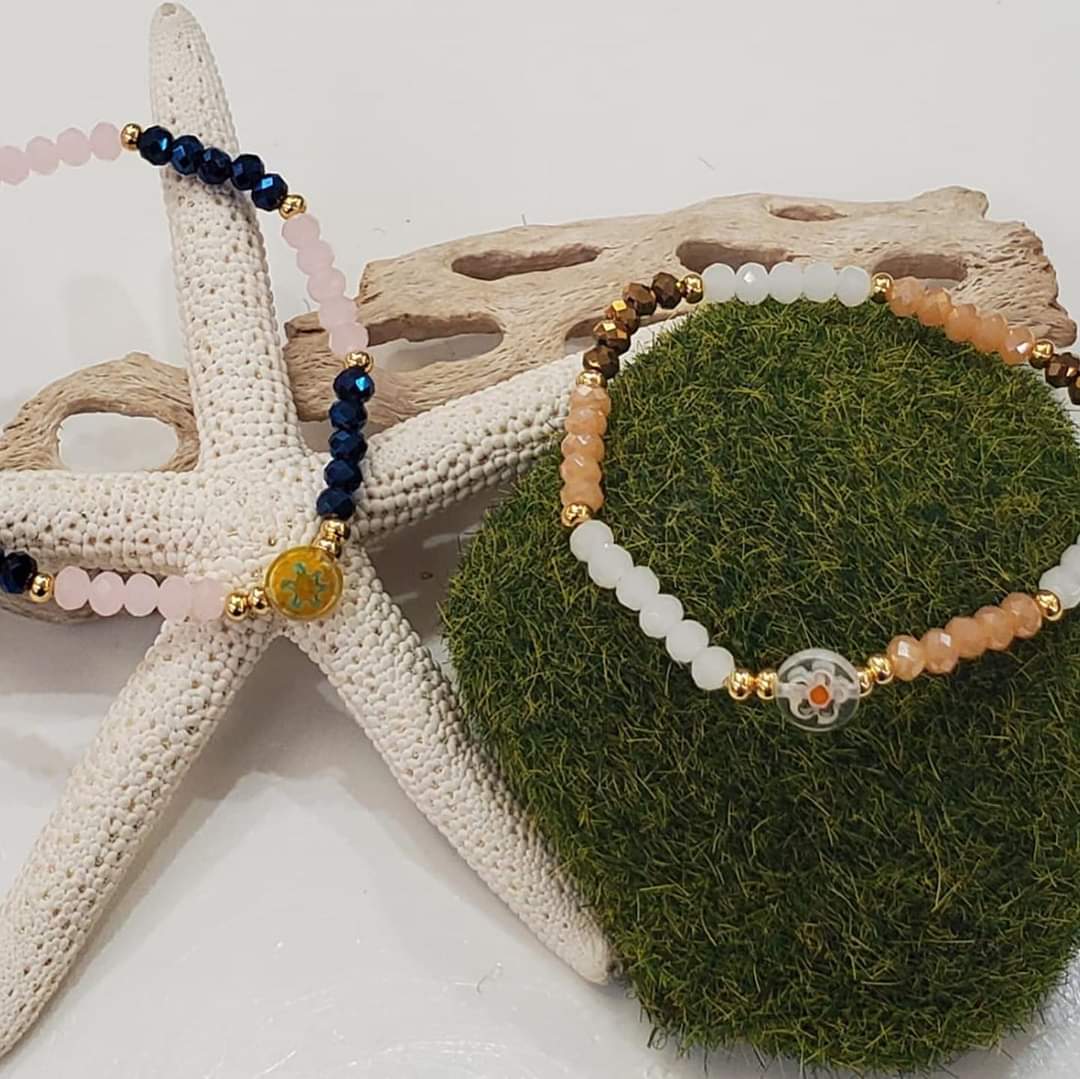Preciosas y delicadas pulseras elásticas confeccionadas a mano con cristales rondelle checos y un cristal murano. Sus detalles son en oro "goldfilled" y/o plateado "plated". Perfectas para uso diario como para una ocasión especial. Piezas resistentes al agua y sudor.