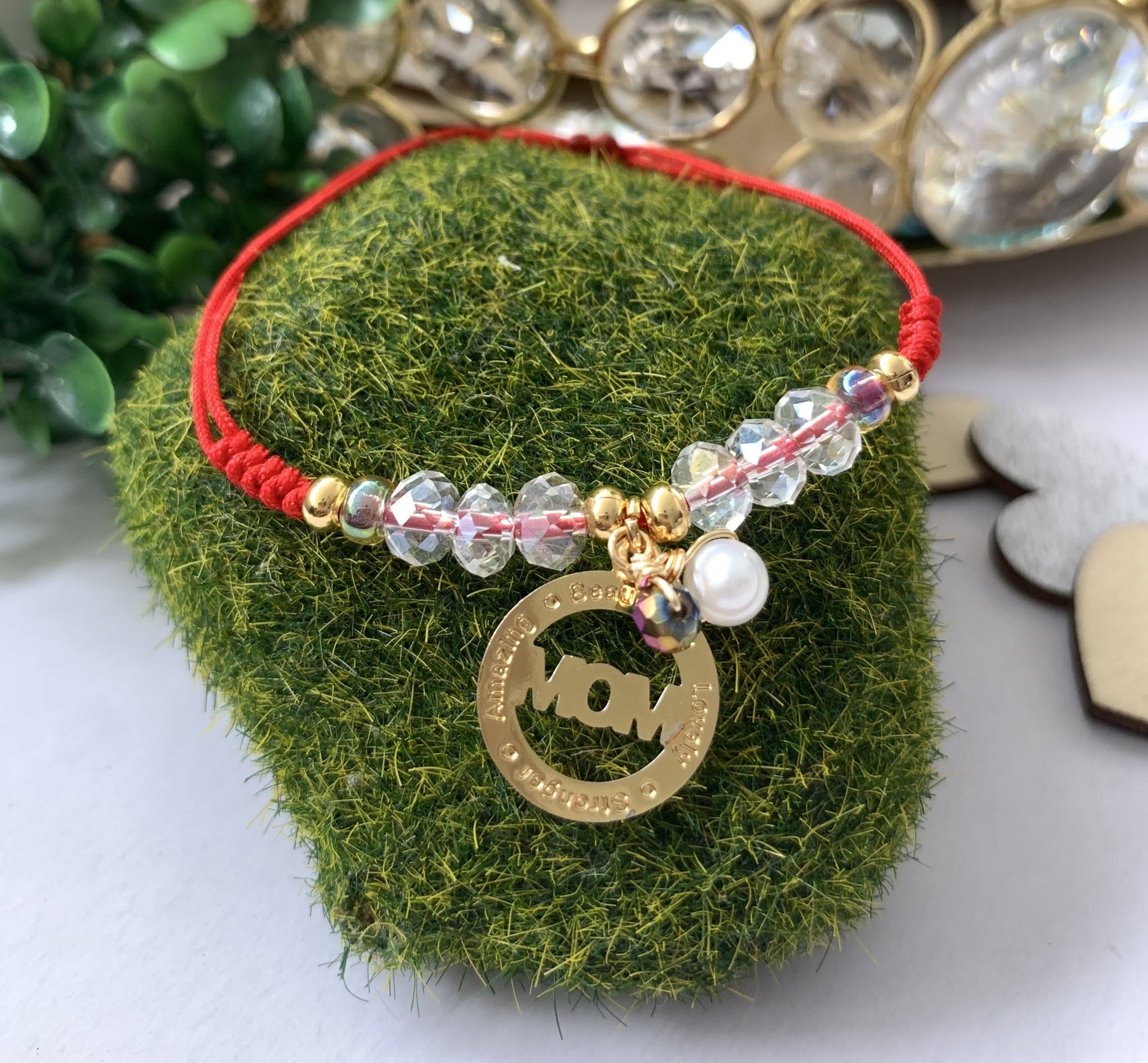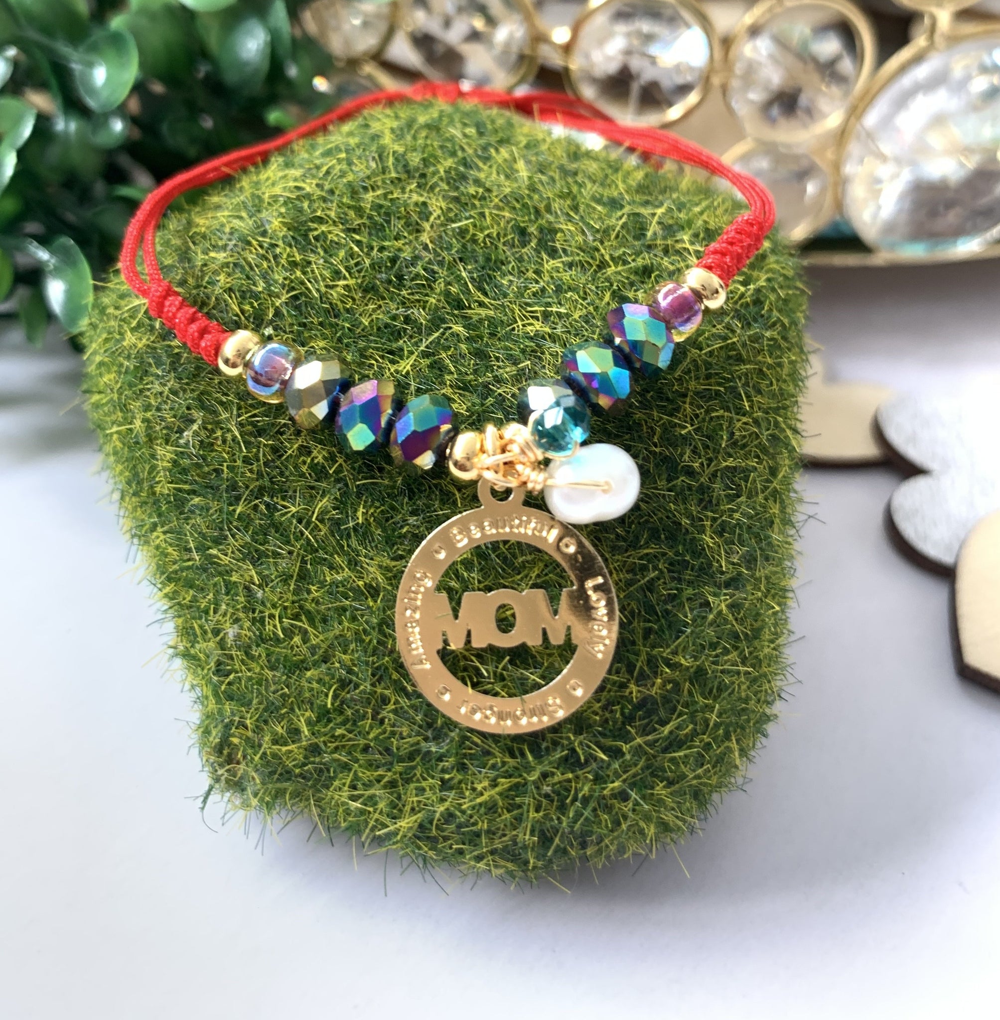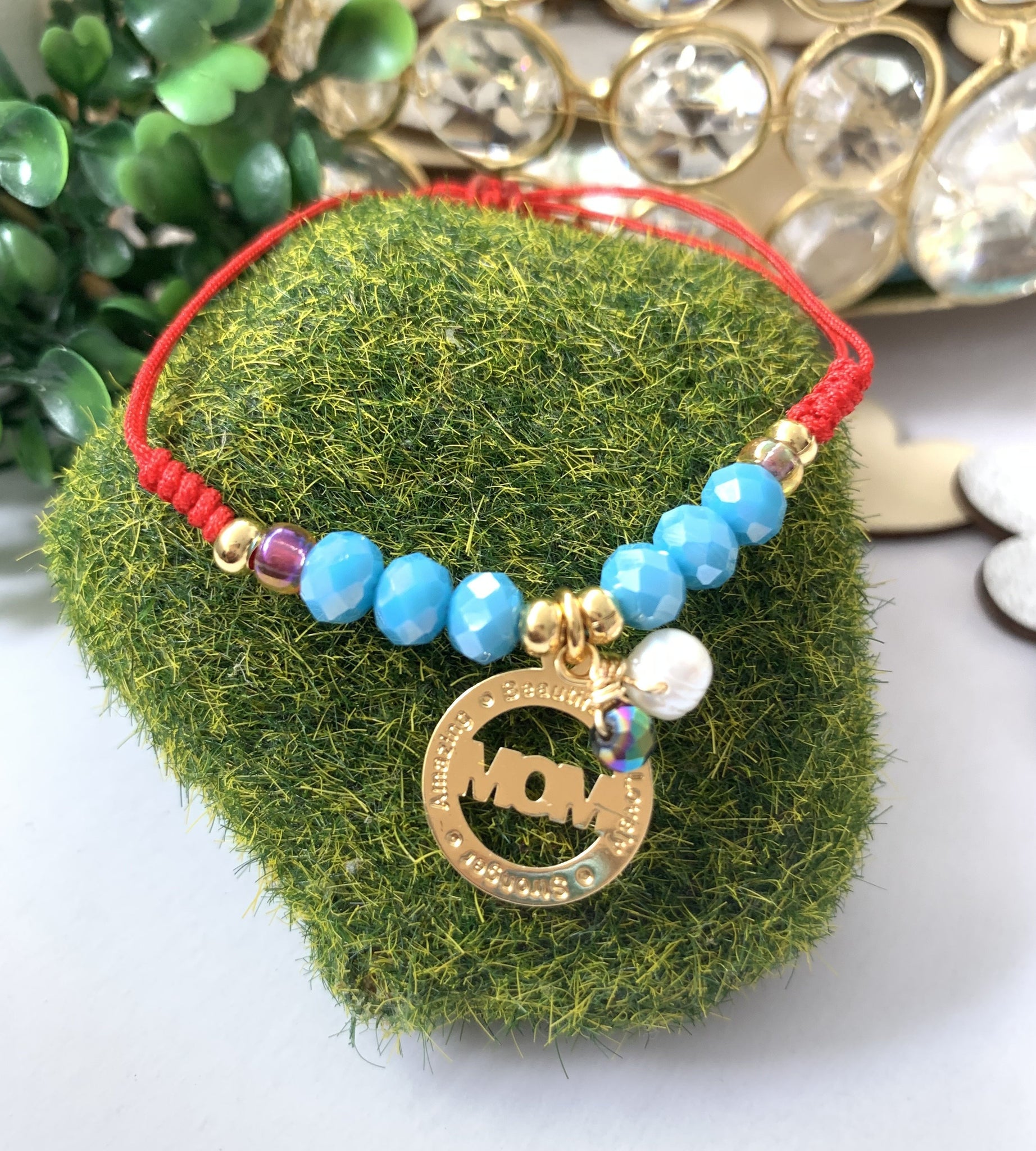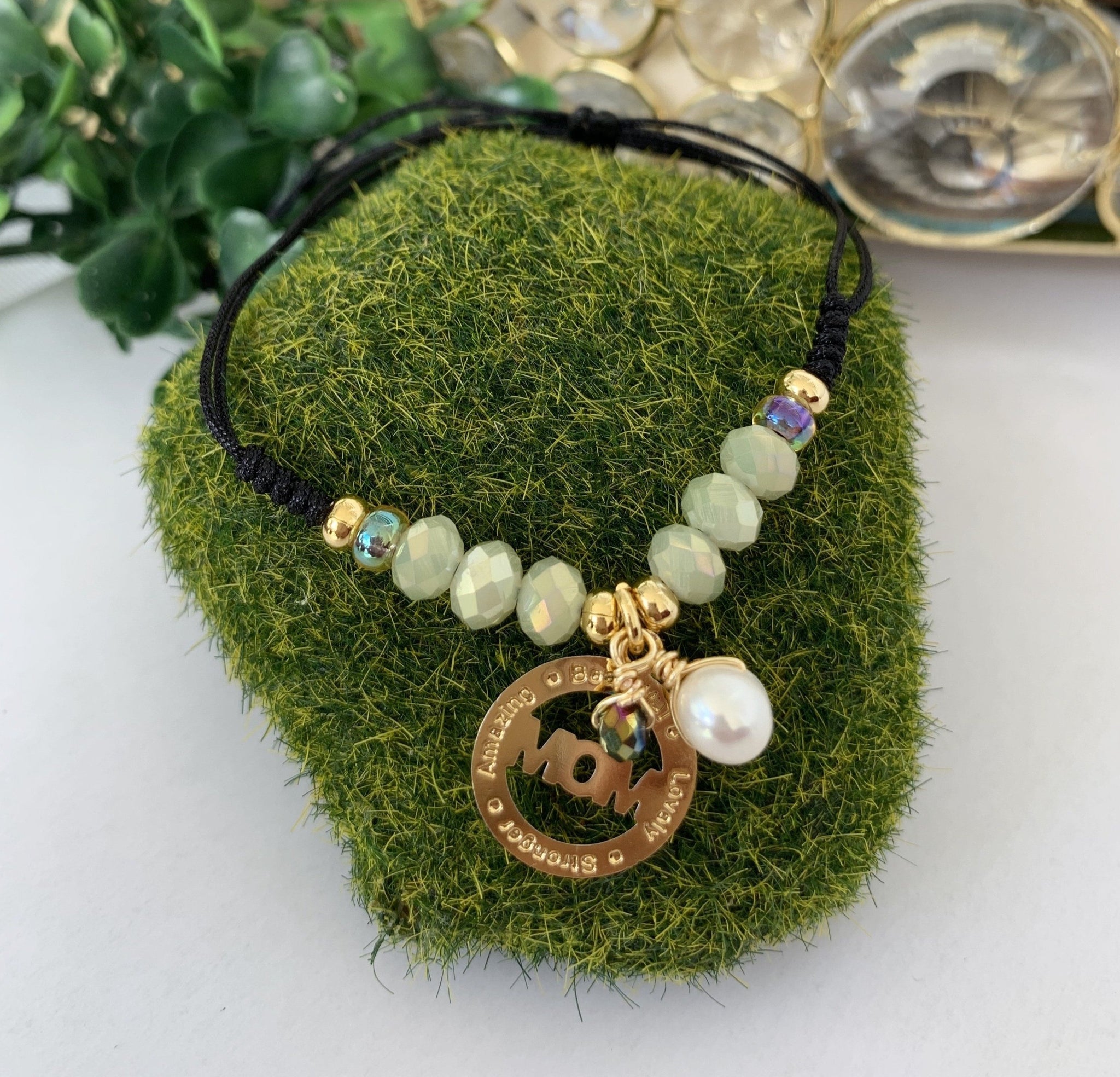 Pulsera confeccionada a mano en hilo ajustable con una medalla de MOM con los grabados de Beautiful, Lovely, Amazing y Stronger. Excelente joyería para regalar a mamá, no se despinta, tiene un bello estilo moderno y fino. Esta pulsera esta acompañada de una perla original de agua dulce, cristales y los detalles dorados son en "goldffilled". Resistentes al agua.