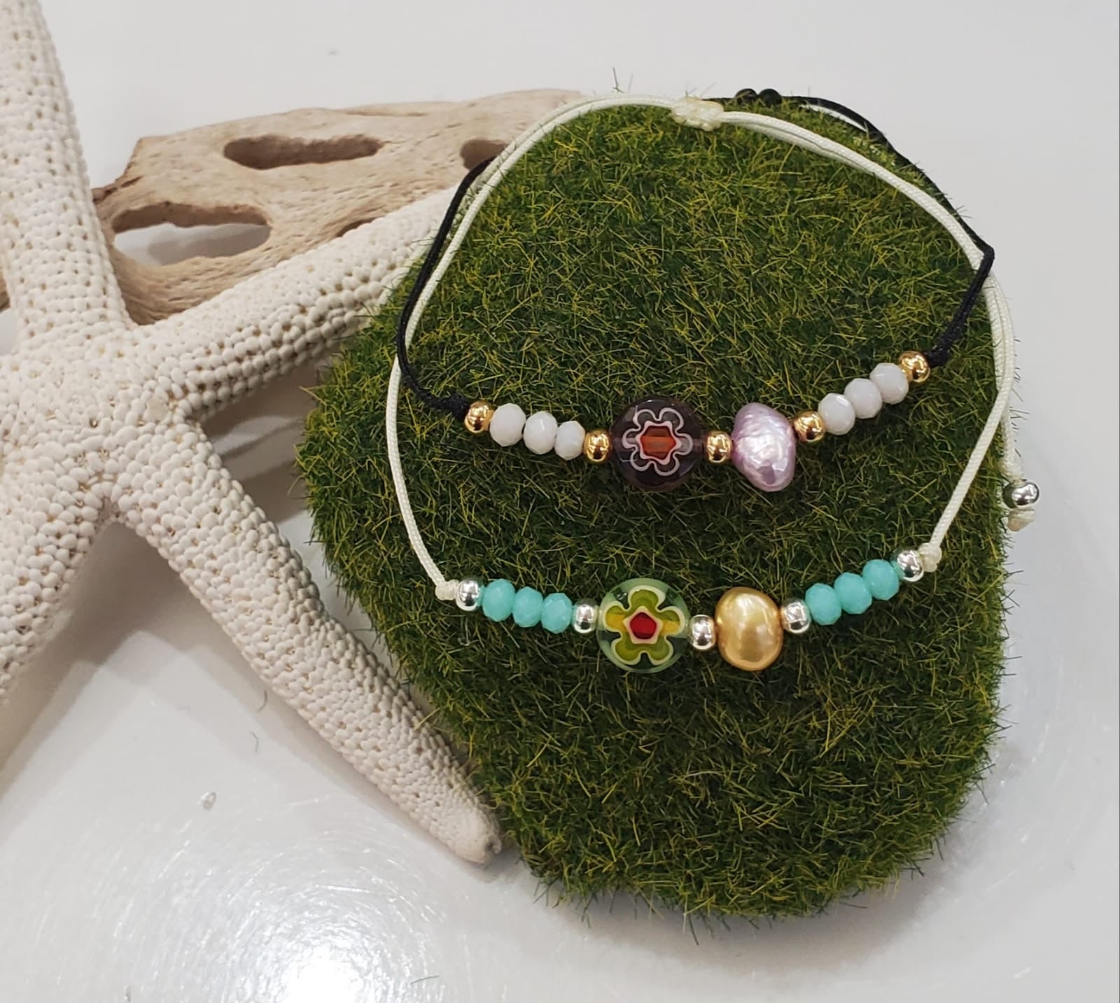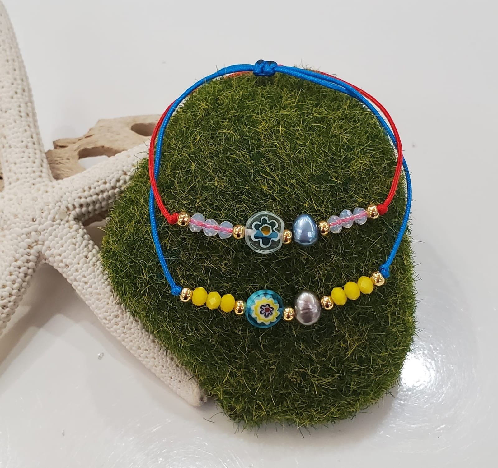 Hermosa pulsera colorida confeccionada con murano multicolor, en hilo nylon ajustable, con cristales y acompañado con una perla original de agua dulce. Pieza resiste al agua y al sudor.