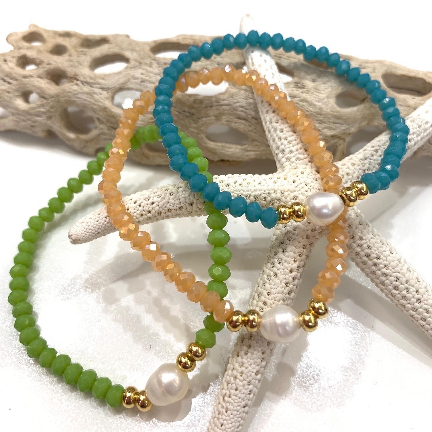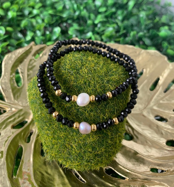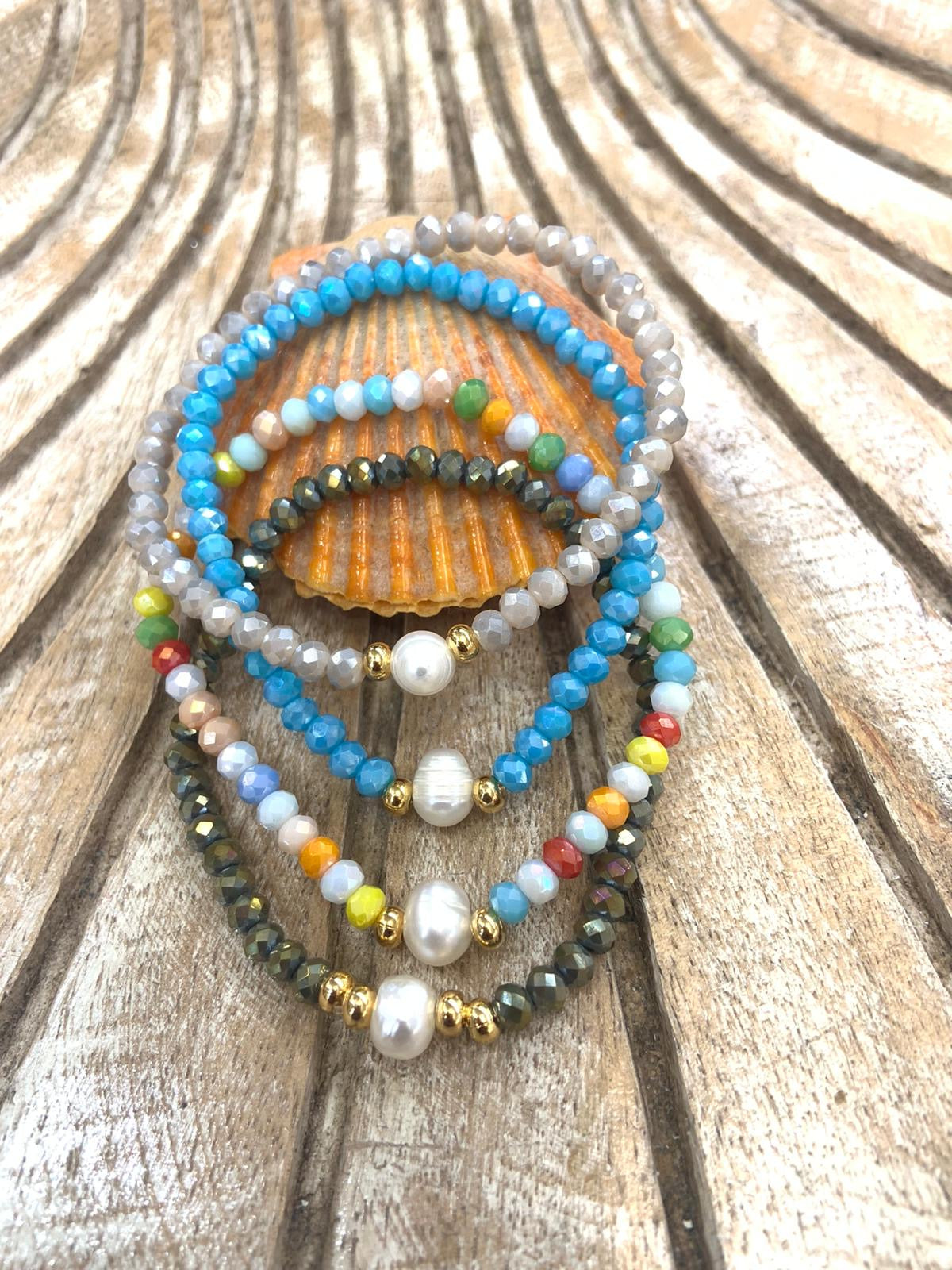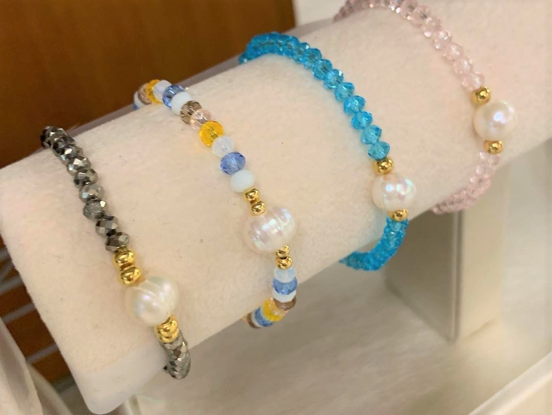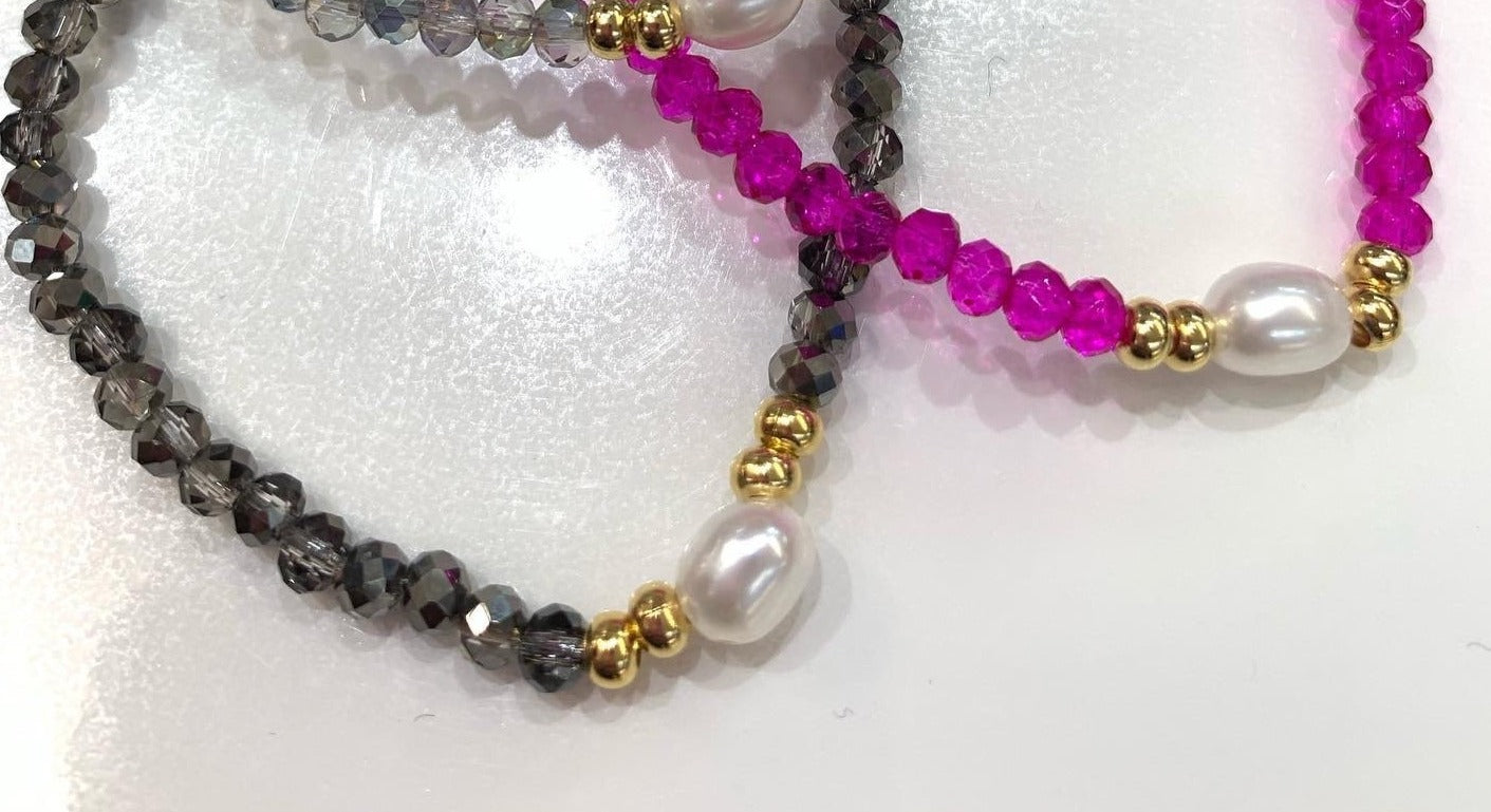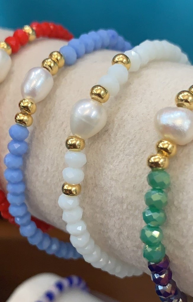 Preciosas pulseras elásticas confeccionadas a mano con una perla blanca original de agua dulce montada con cristales rondelle checo, con detalles en oro goldfilled. Pieza resistente al agua. Perfectas para uso diario como para una ocasión especial.