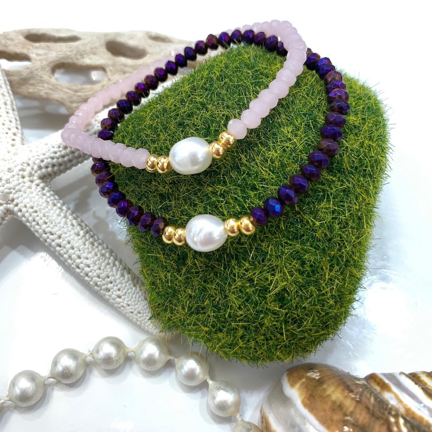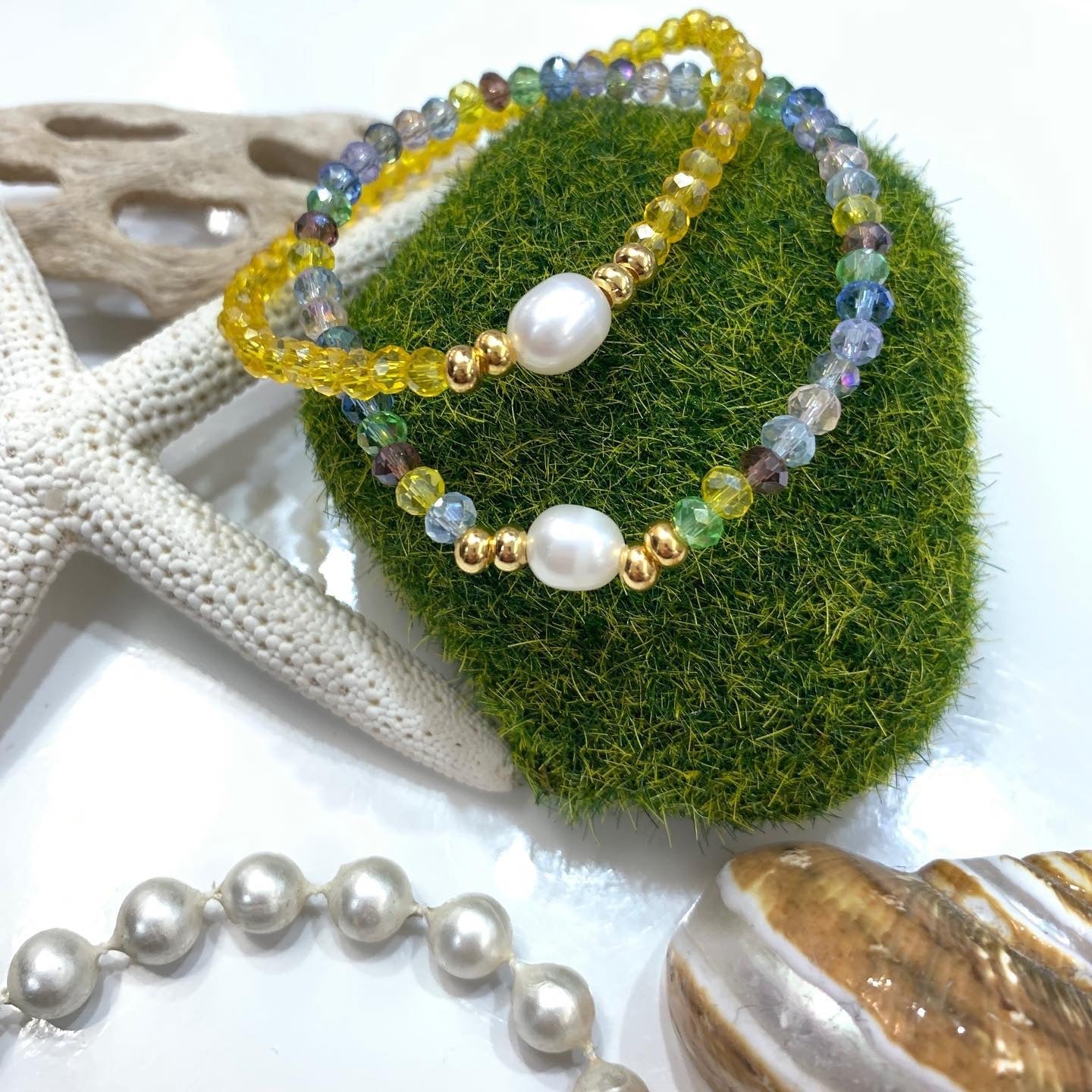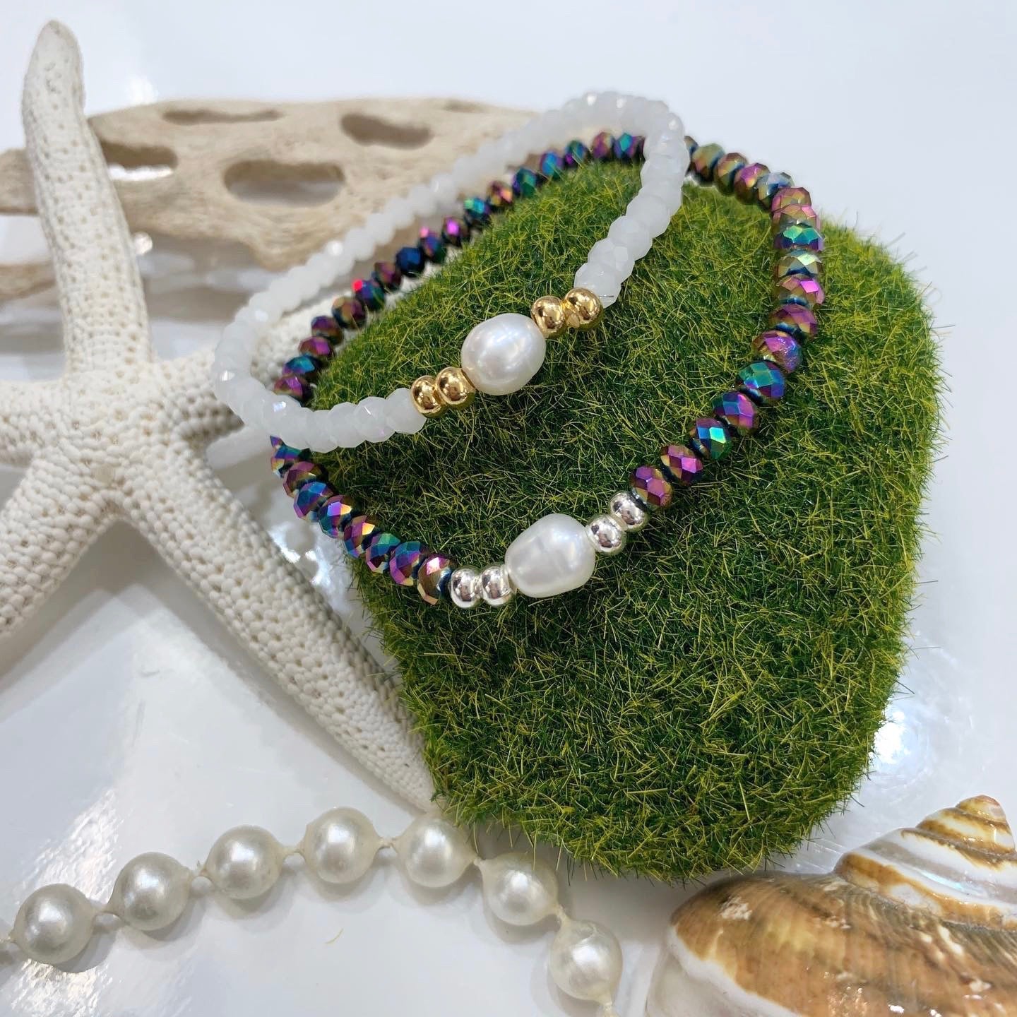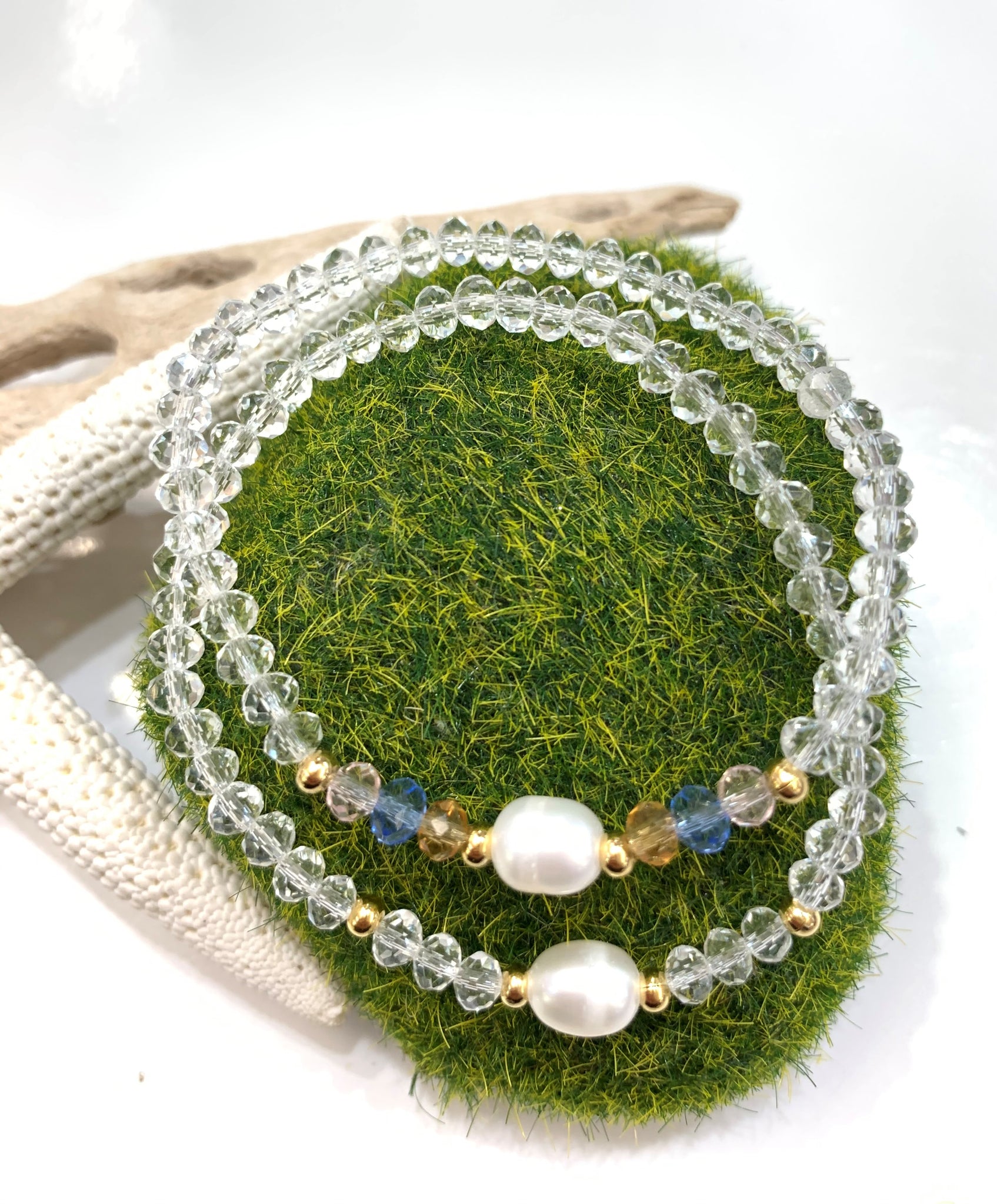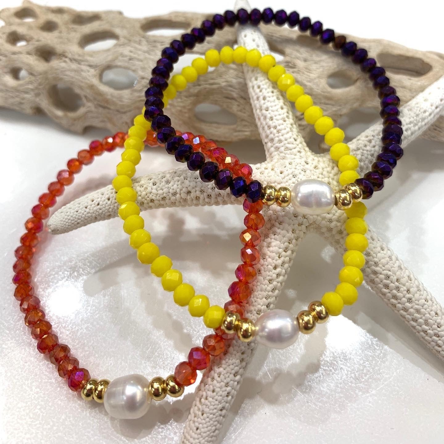 Preciosas pulseras elásticas confeccionadas a mano con una perla blanca original de agua dulce montada con cristales rondelle checo, con detalles en oro goldfilled. Pieza resistente al agua. Perfectas para uso diario como para una ocasión especial.