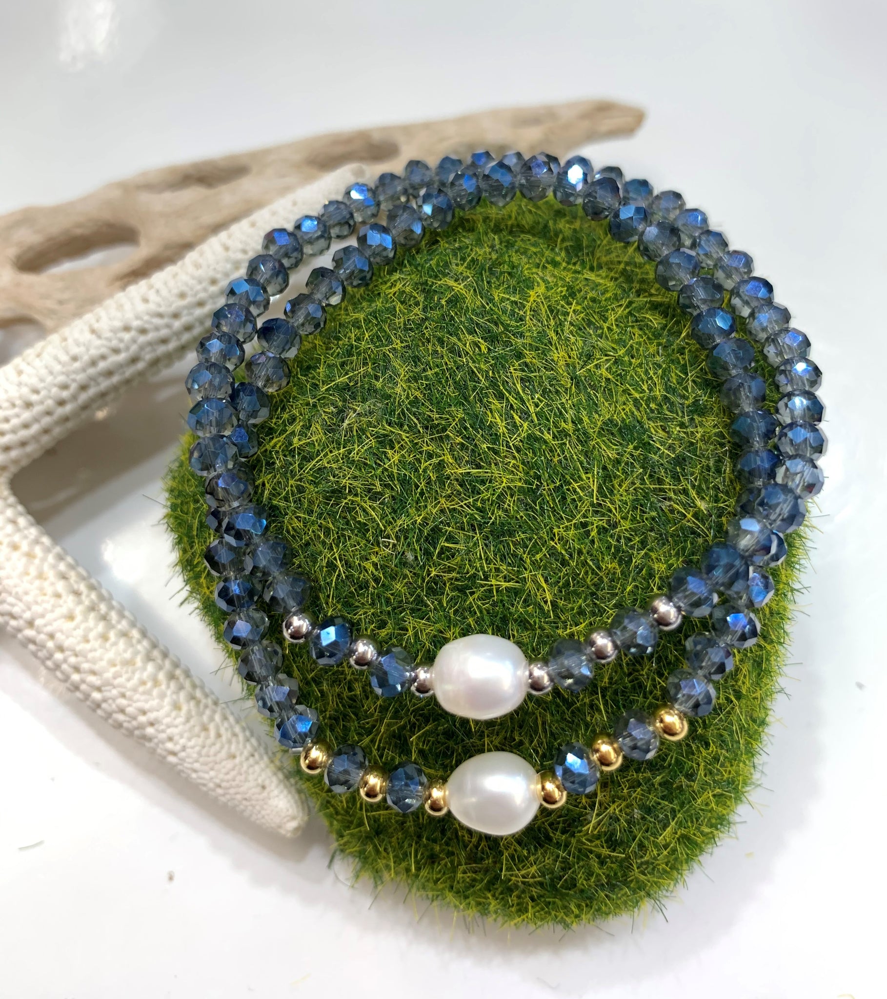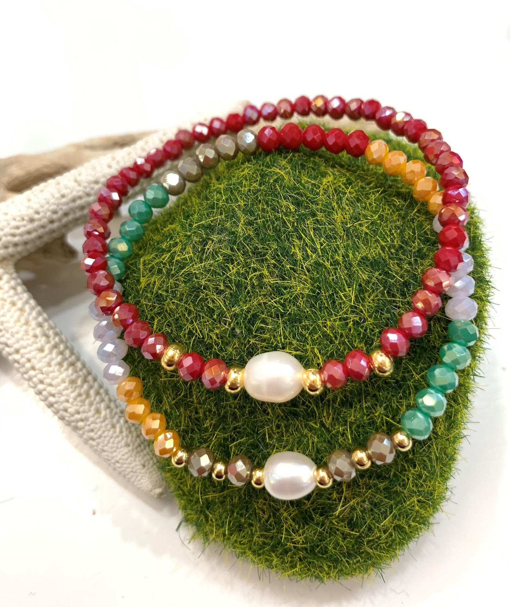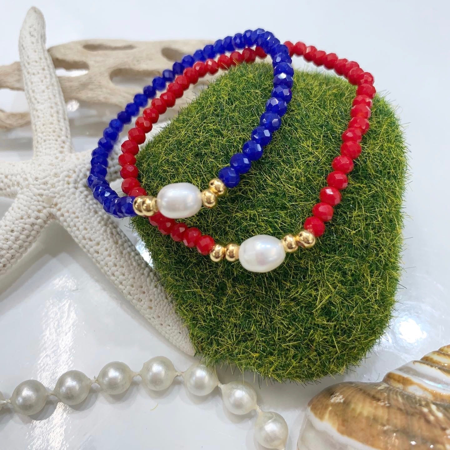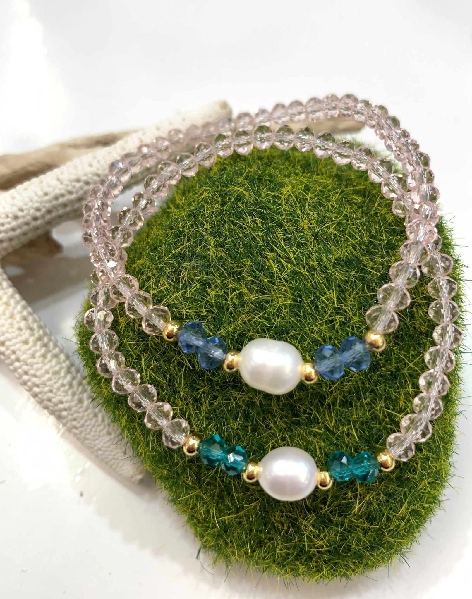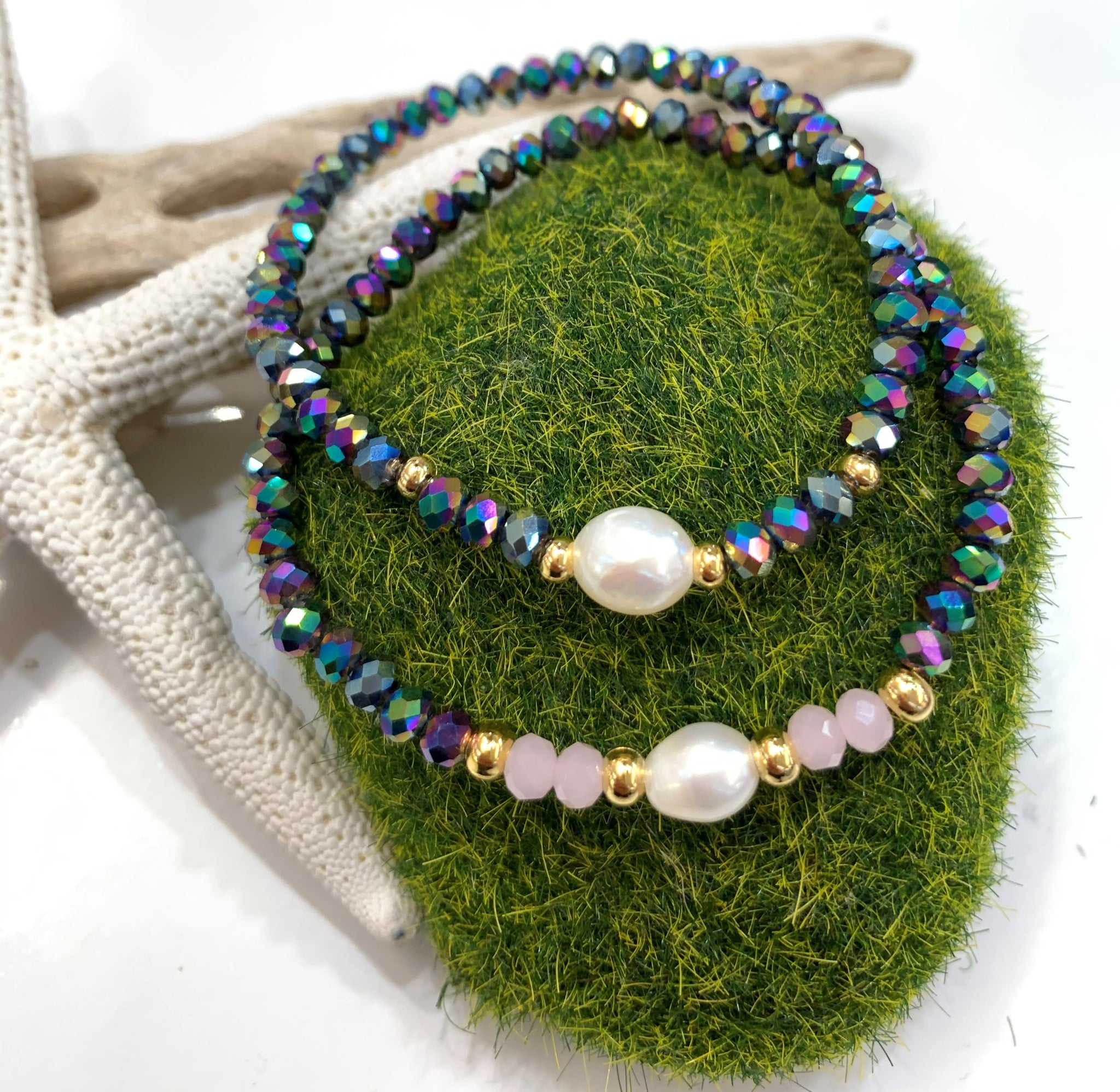 Preciosas pulseras elásticas confeccionadas a mano con una perla blanca original de agua dulce montada con cristales rondelle checo, con detalles en oro goldfilled. Pieza resistente al agua. Perfectas para uso diario como para una ocasión especial.