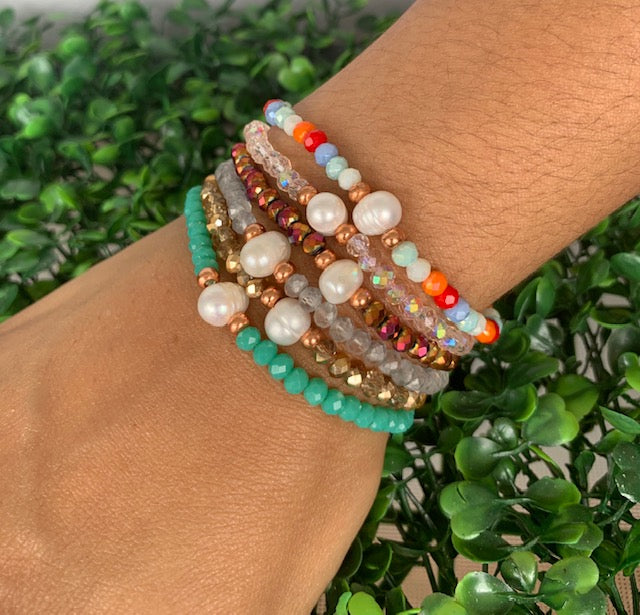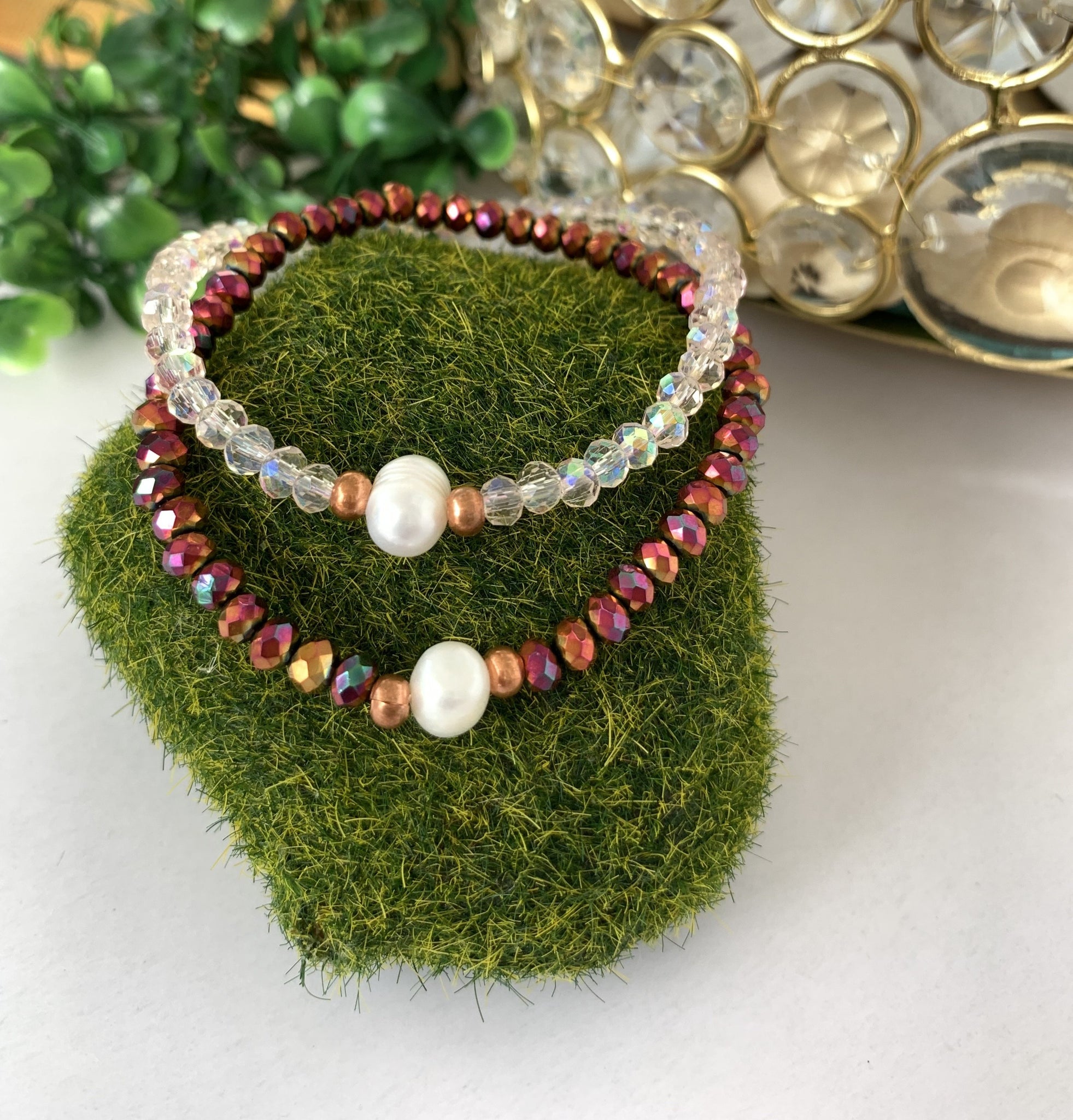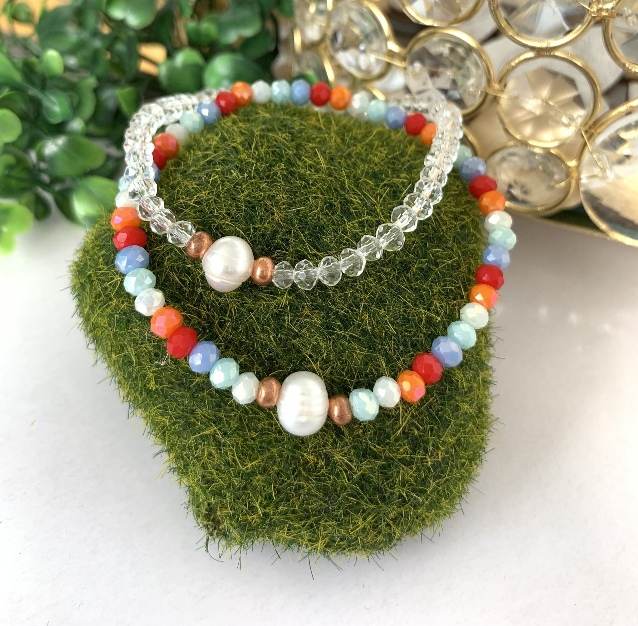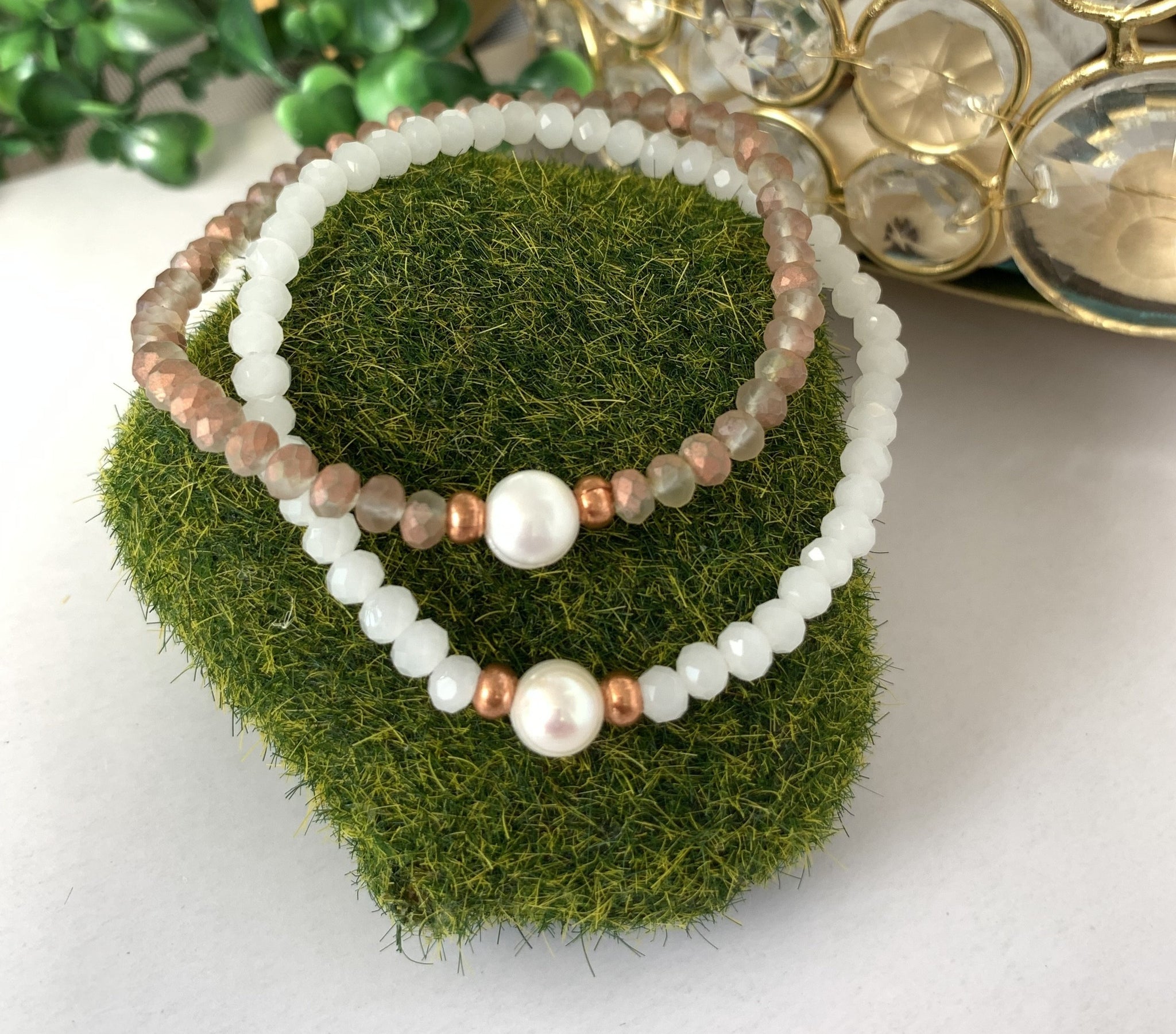Preciosas pulseras elásticas confeccionadas a mano con una perla blanca original de agua dulce montada con cristales rondelle checo, con detalles en oro rosado plated. Pieza resistente al agua. Perfectas para uso diario como para una ocasión especial.