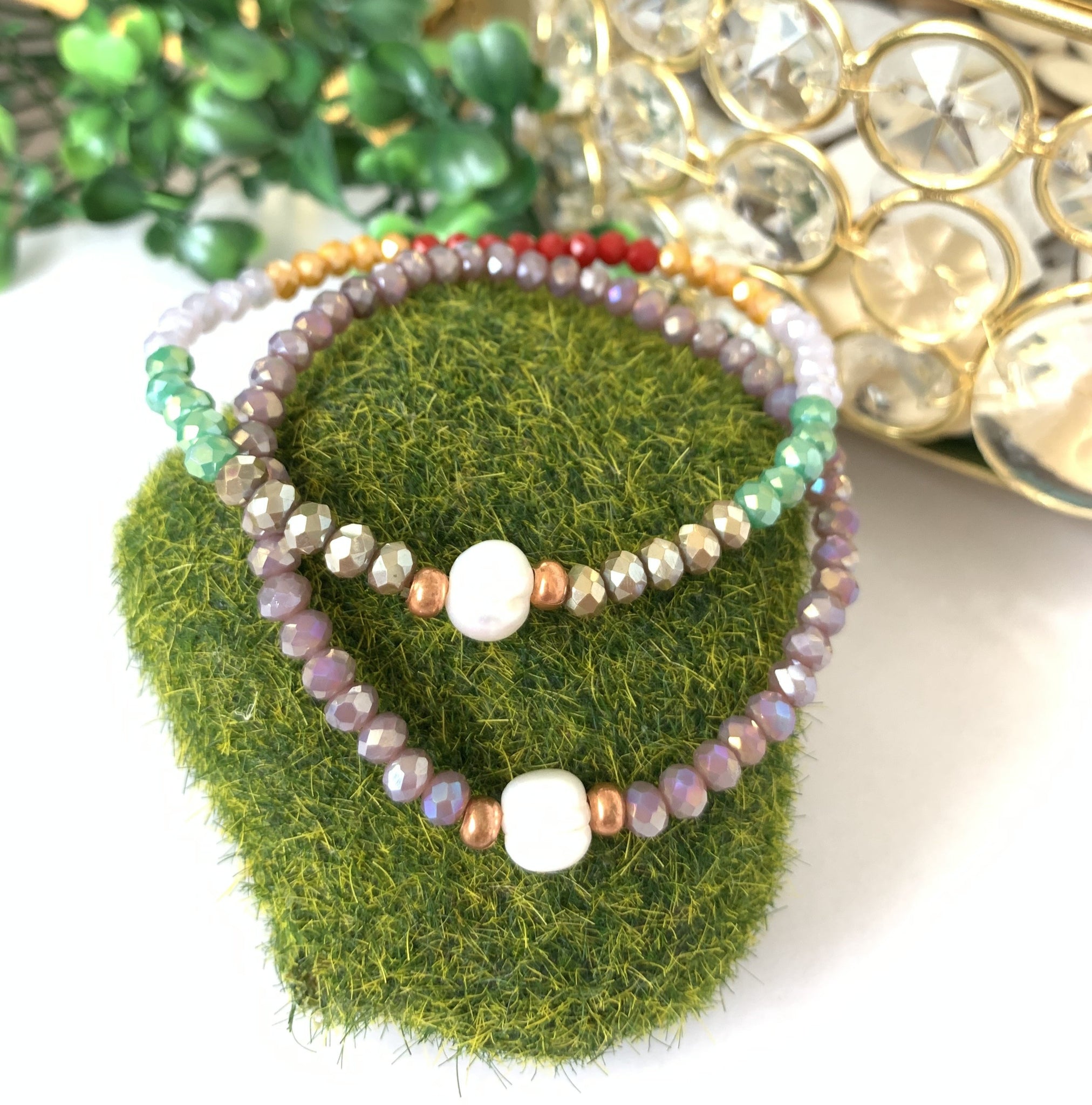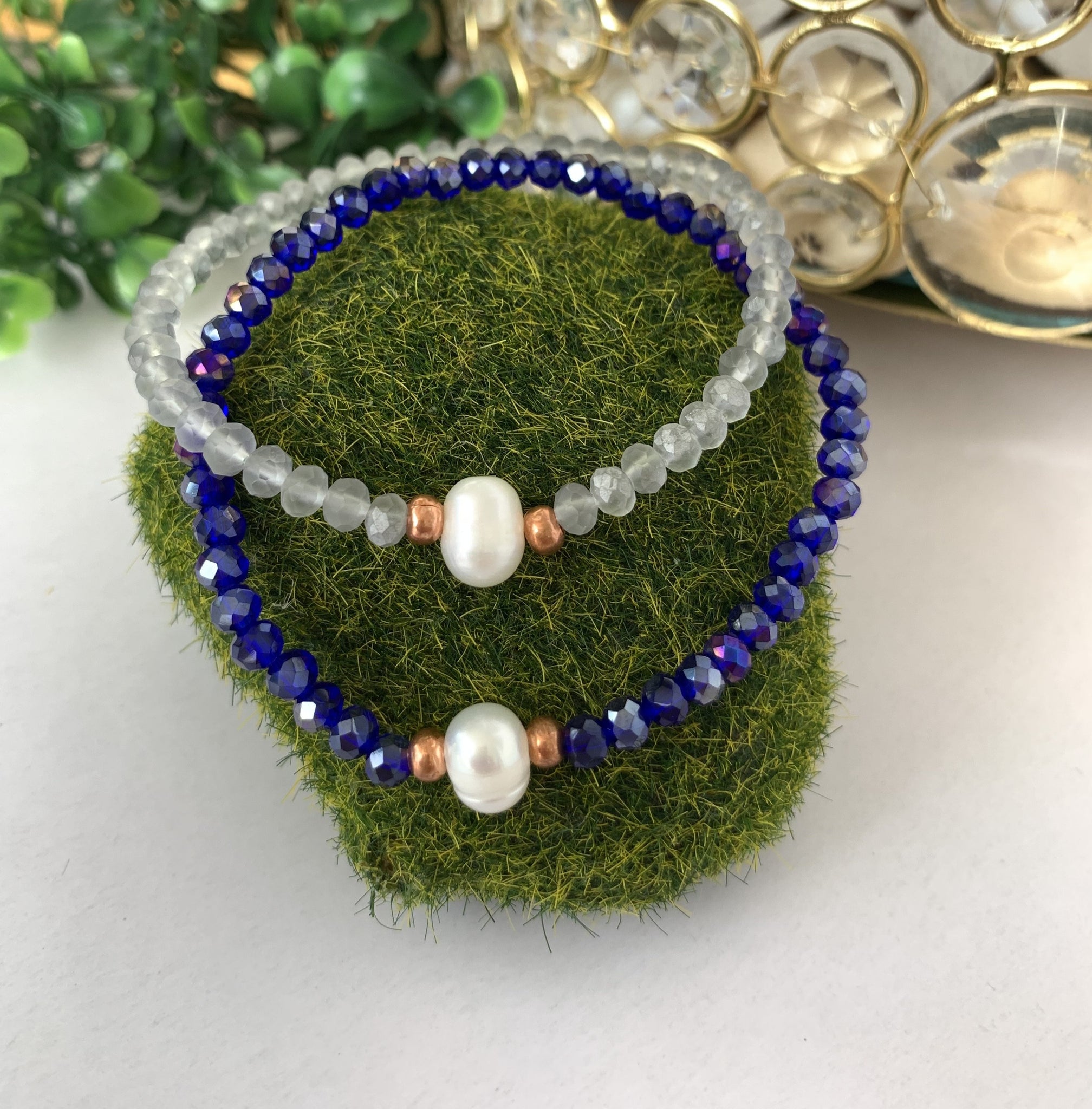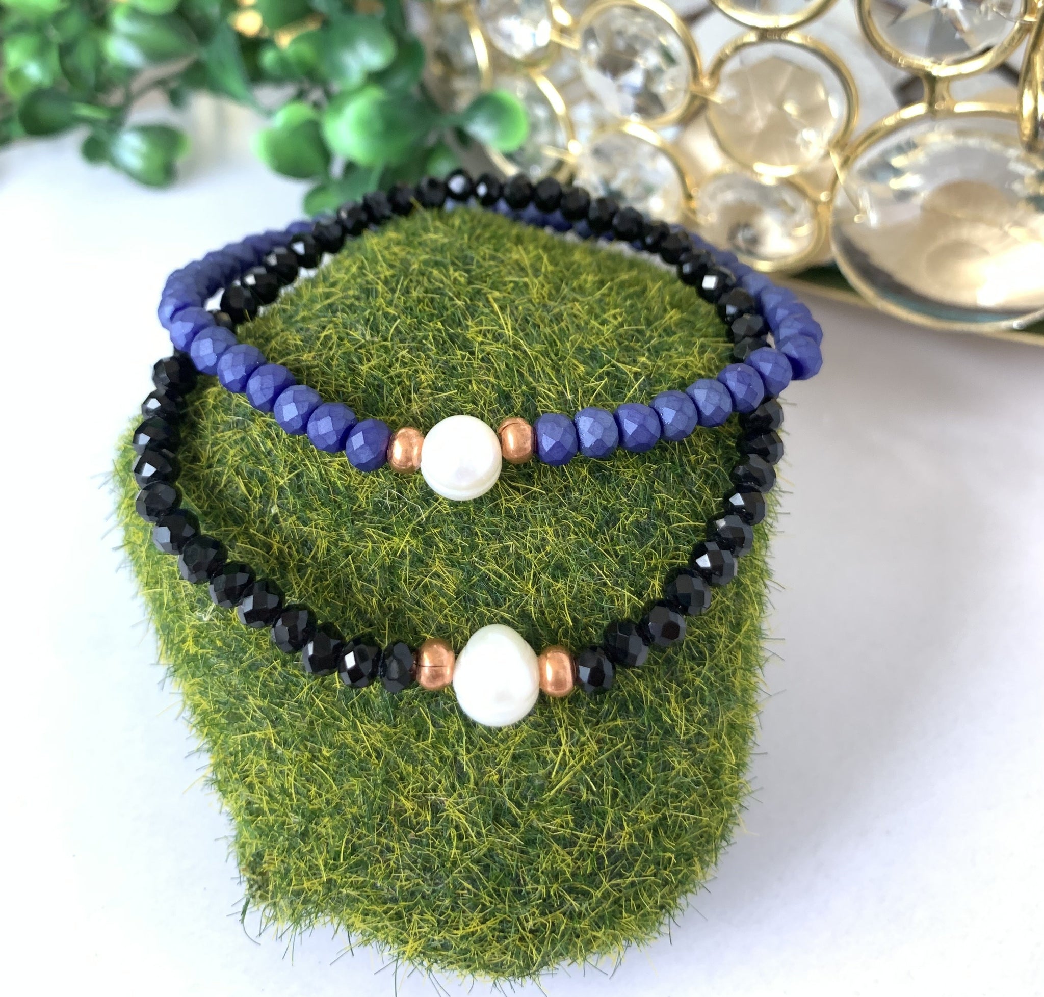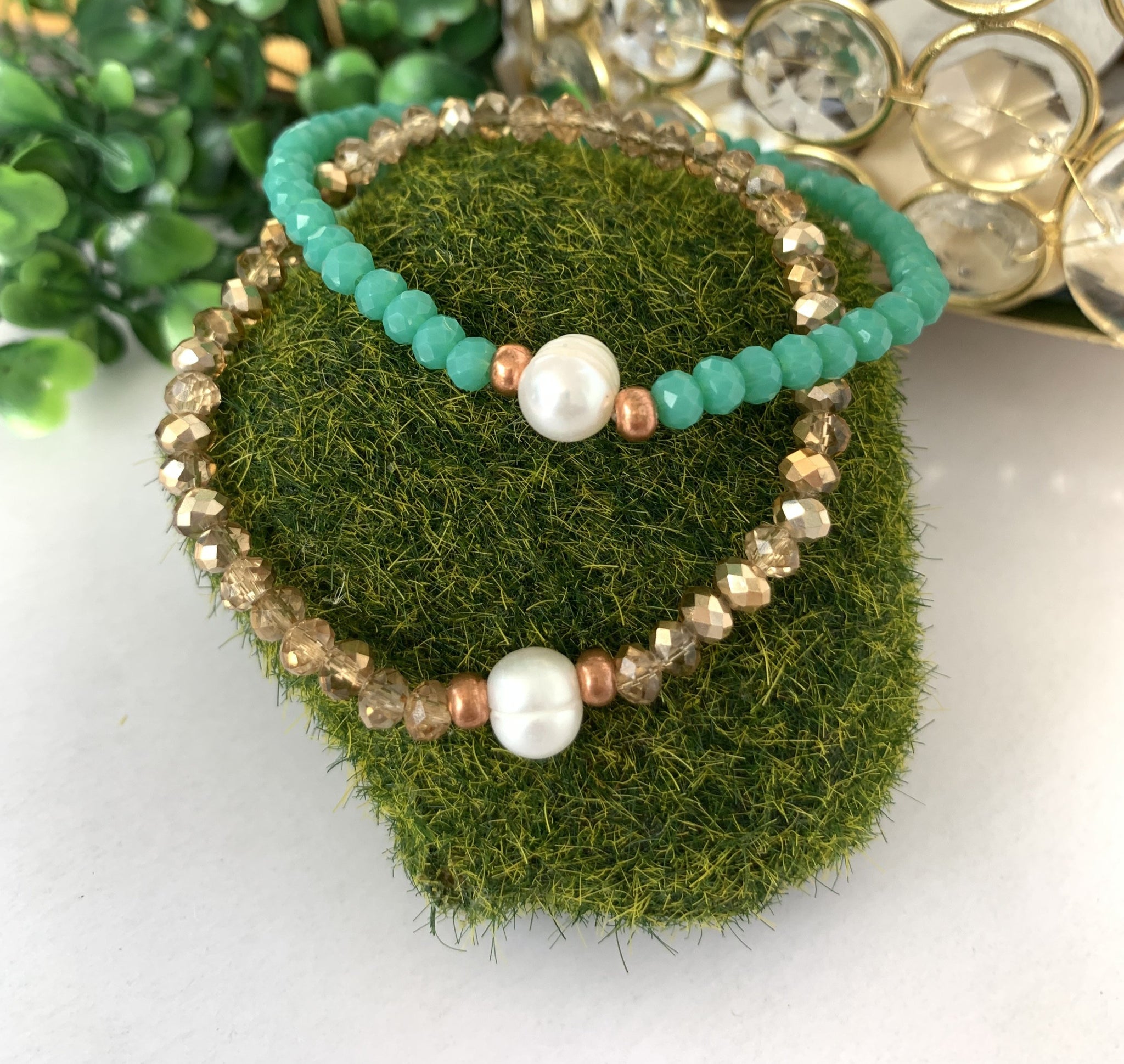 Preciosas pulseras elásticas confeccionadas a mano con una perla blanca original de agua dulce montada con cristales rondelle checo, con detalles en oro rosado plated. Pieza resistente al agua. Perfectas para uso diario como para una ocasión especial.