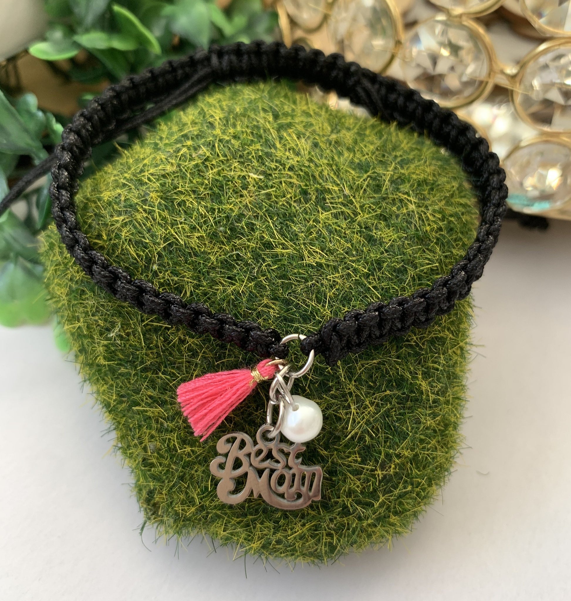 Pulsera confeccionada a mano con un "charms" de Best Mom montada en hilo de nylon macramé ajustable. Excelente joyería para regalar a mamá, no se despinta, no se deshila y tiene un bello estilo moderno y fino. Esta pulsera esta acompañada de una perla original de agua dulce, una mini borla y los detalles plateados son en "stainless steel". Resistentes al agua.