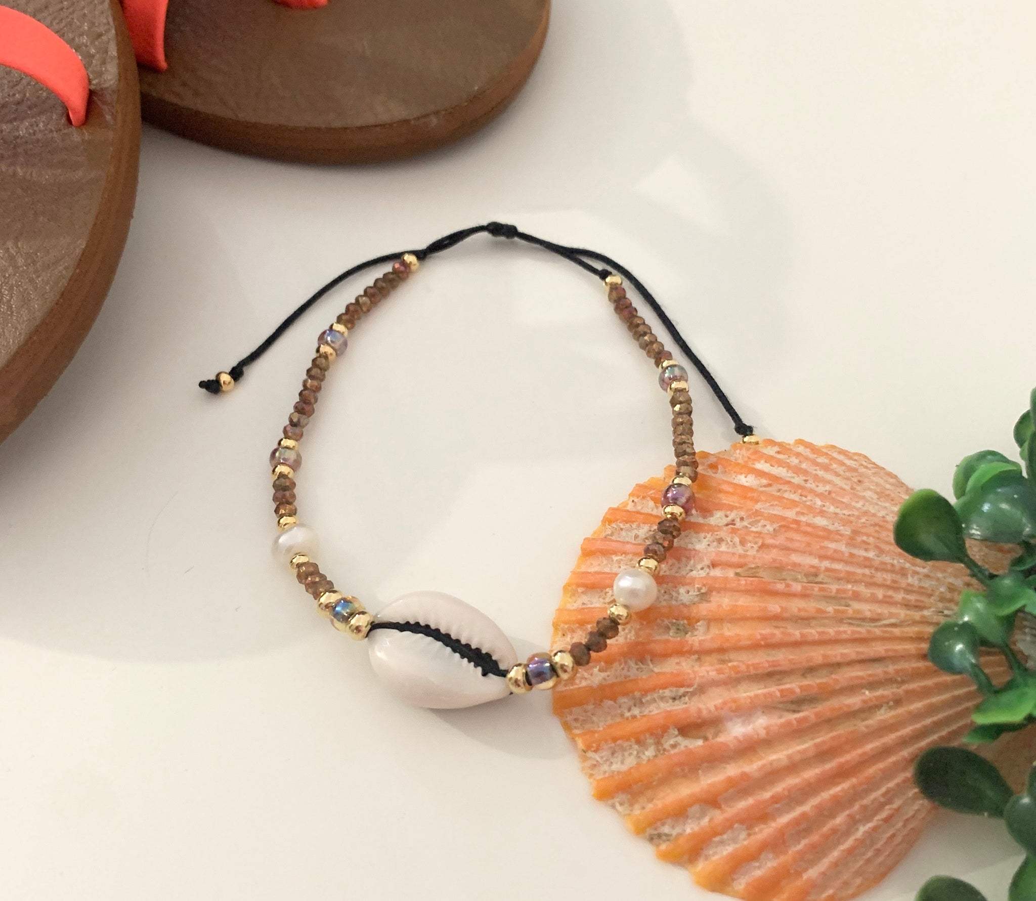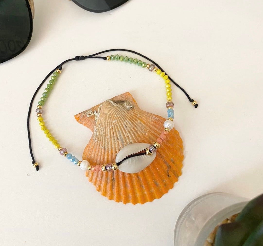 Pulsera confeccionada a mano en hylon ajustable con un caracol, cristales y perla original. Excelente pieza para uso diario, como para ir a la playa o piscina. Resiste al agua.