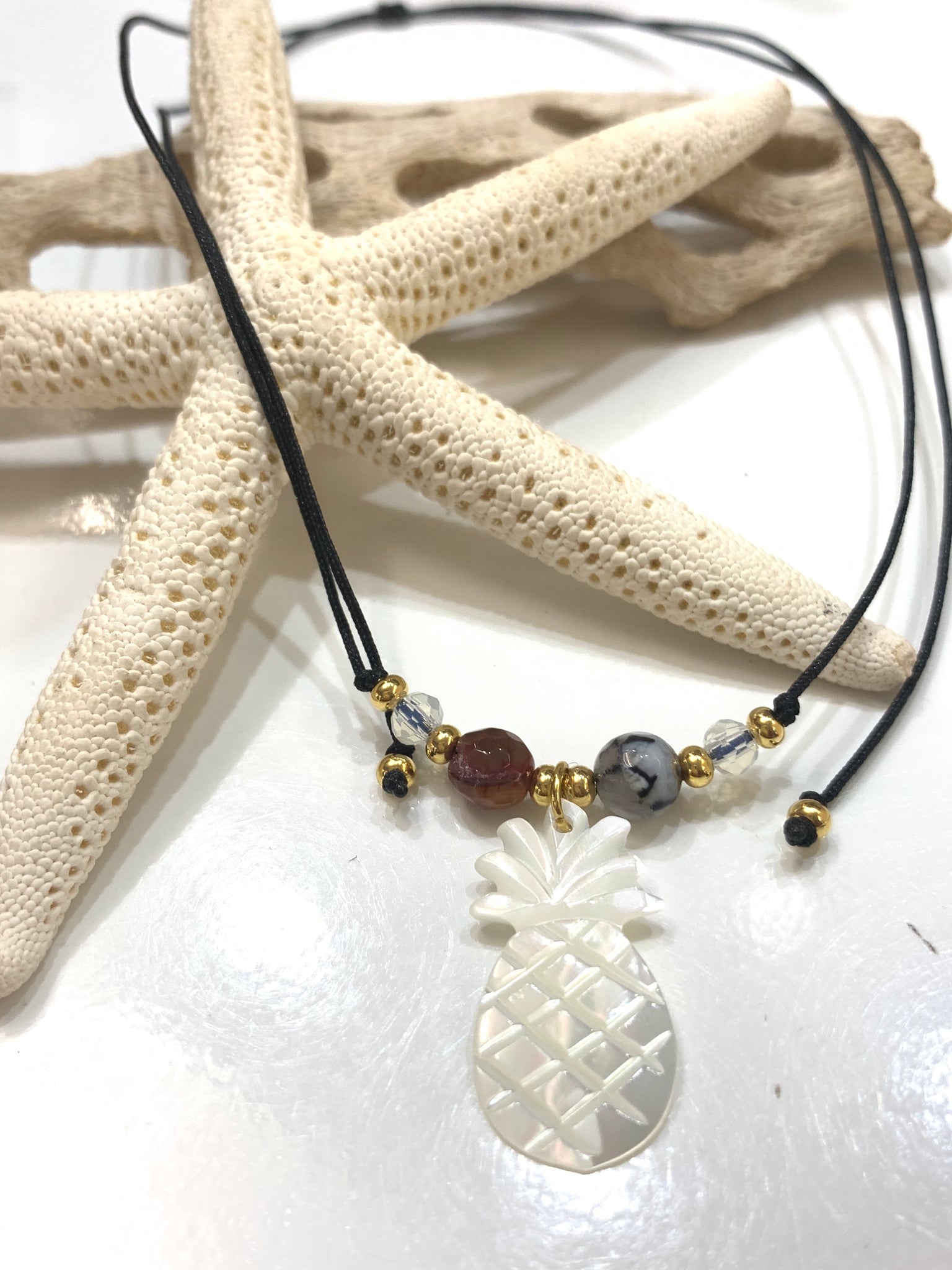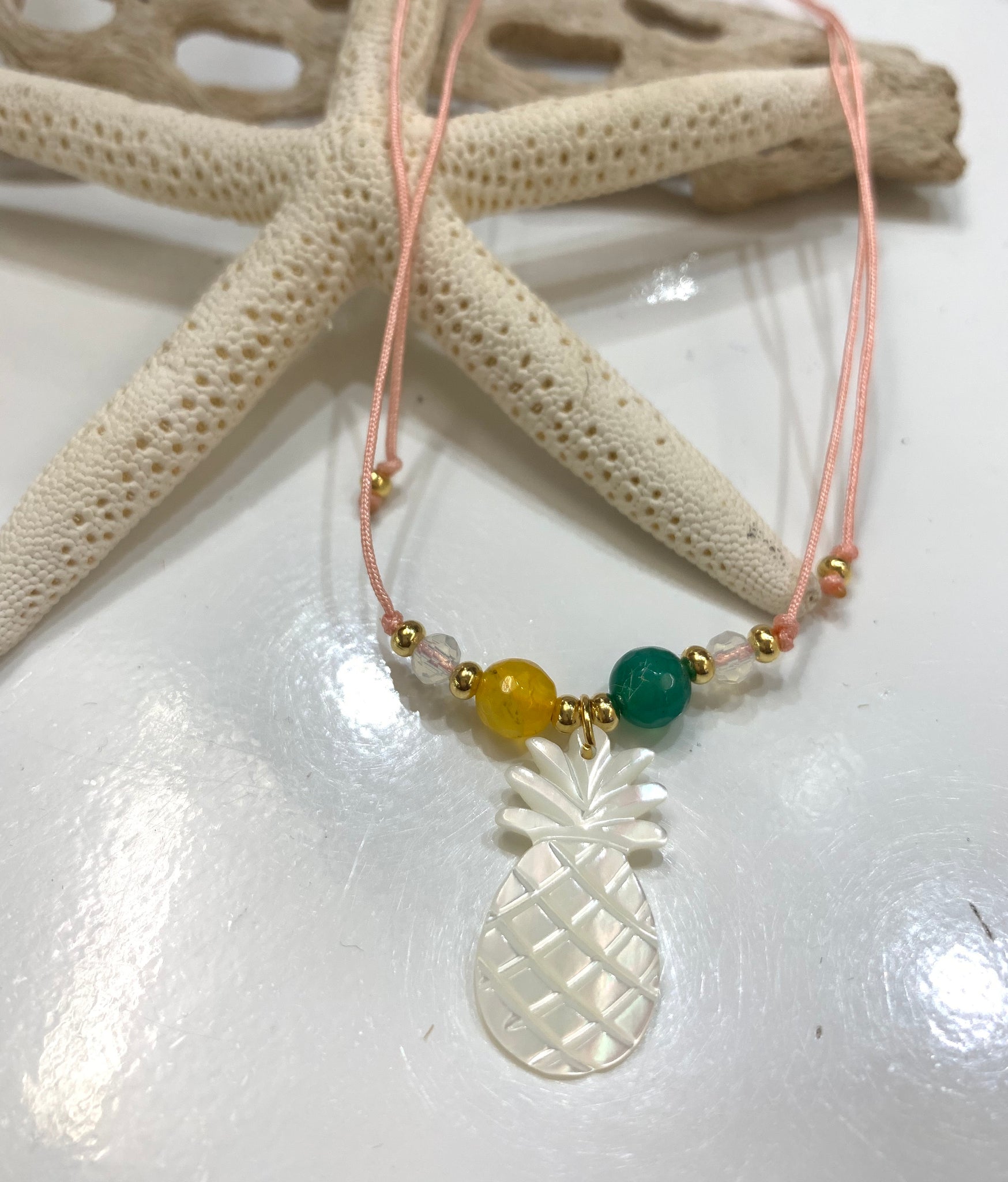 Collar confeccionada a mano en hilo de nylon ajustable con una piña en nácar. Excelente material que no se despinta y tiene un bello reflejo brillante precioso. Las prendas incluyen unos detalles en piedras ágata, cristales, una mini borla y los separadores son en dorado en goldfilled. Resistentes al agua.