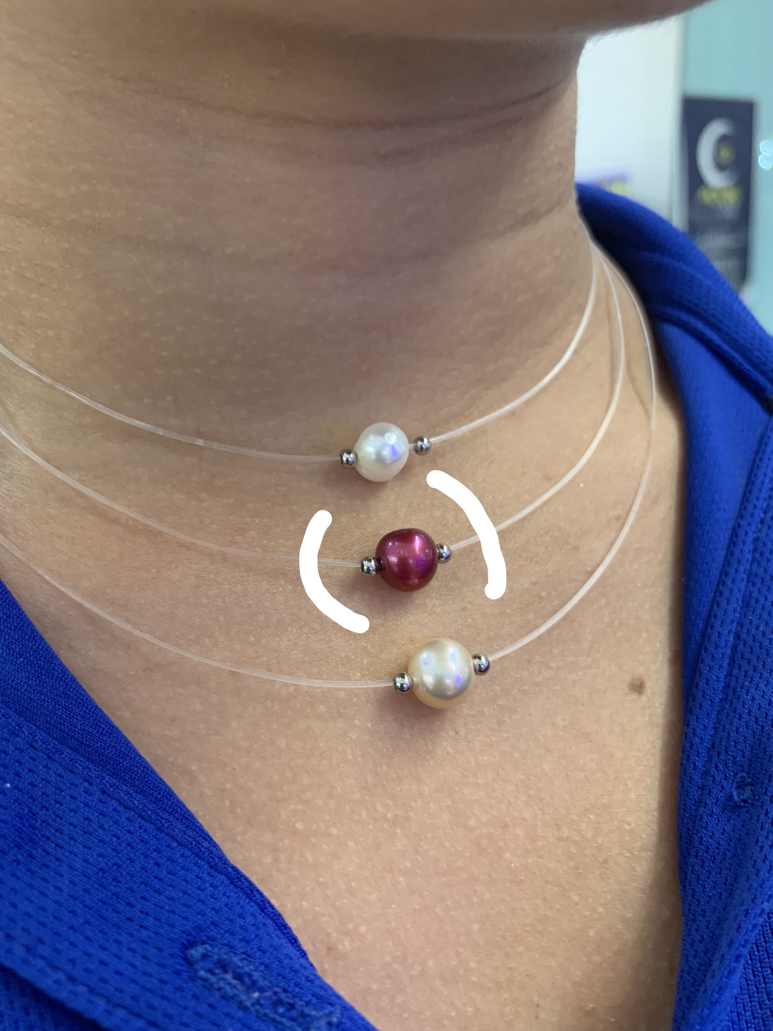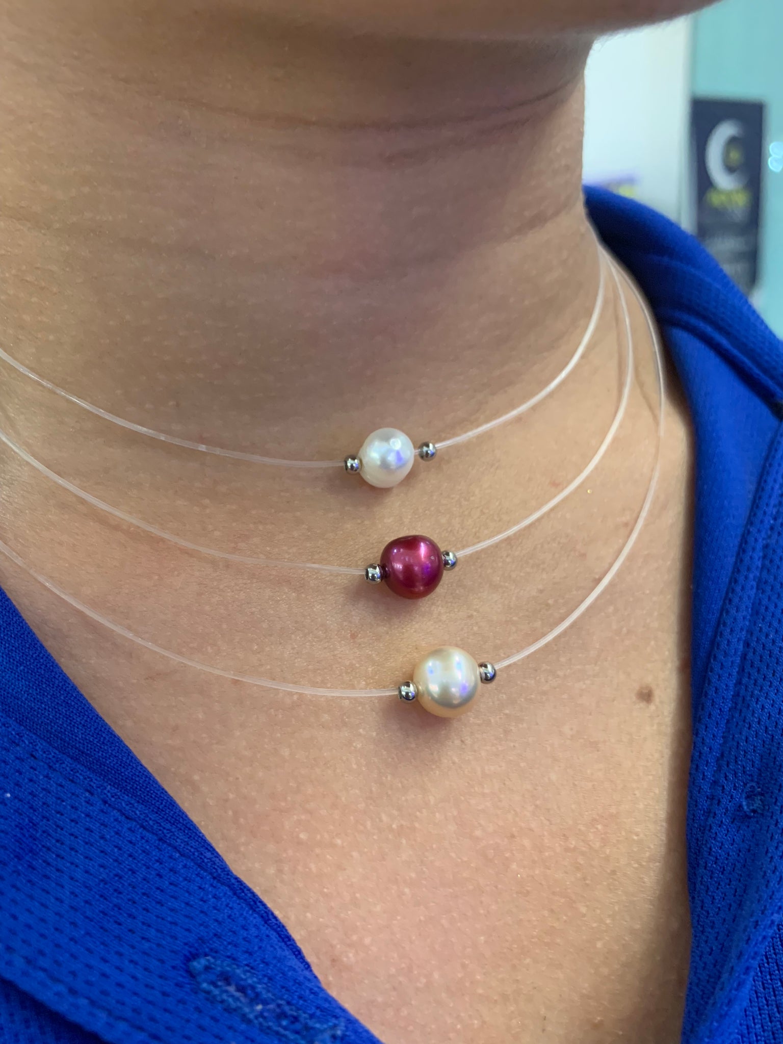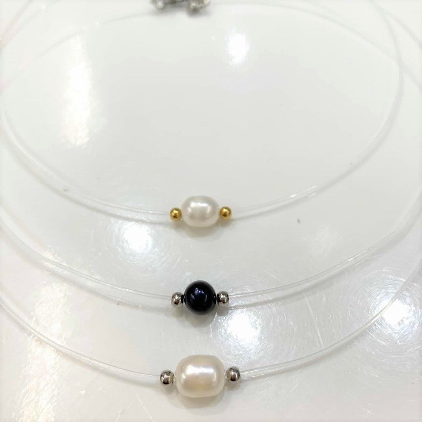 Collar confeccionado a mano en cordón transparente en donde añadimos una perla original de agua dulce. Excelente joyería que no se despinta, tiene un bello estilo moderno y fino. Se puede utilizar para uso diario o para una ocasión especial.  Este collar tiene los separadores en dorados"goldfilled" o plateado e incluye broches en "stainless steel.  Resistentes al agua.