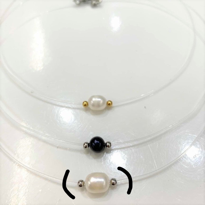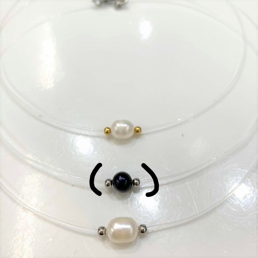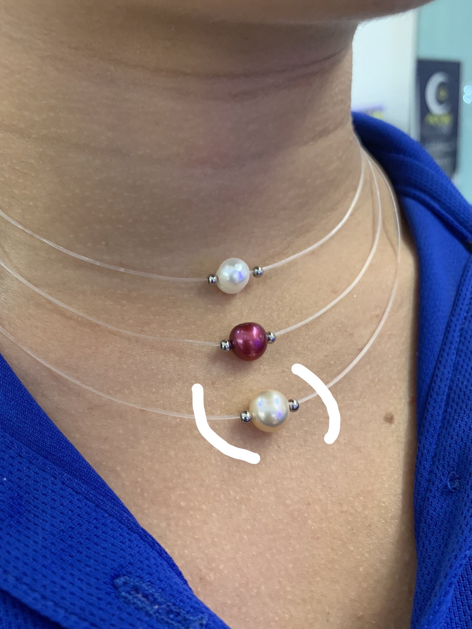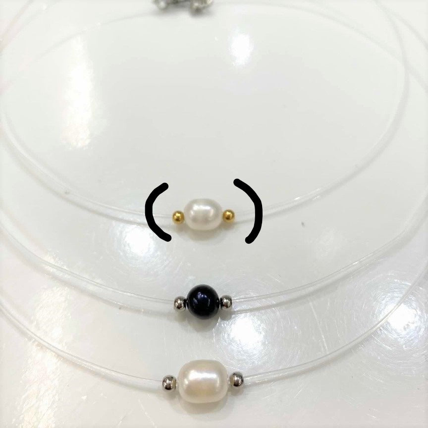 Collar confeccionado a mano en cordón transparente en donde añadimos una perla original de agua dulce. Excelente joyería que no se despinta, tiene un bello estilo moderno y fino. Se puede utilizar para uso diario o para una ocasión especial.  Este collar tiene los separadores en dorados"goldfilled" o plateado e incluye broches en "stainless steel.  Resistentes al agua.