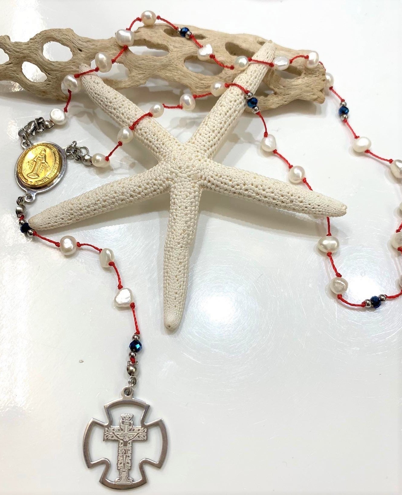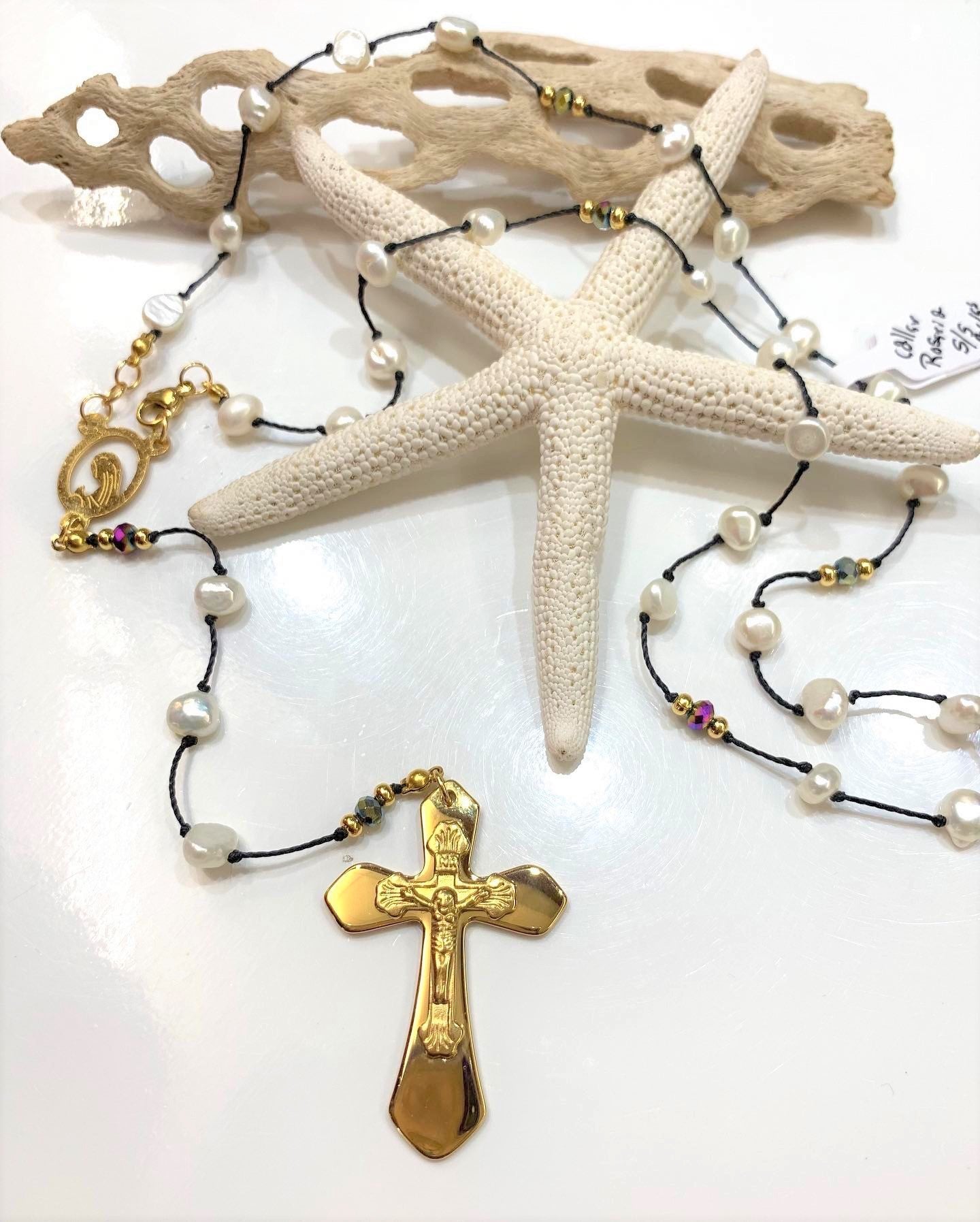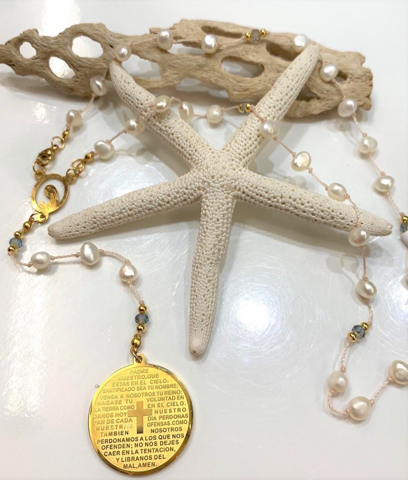Siéntete protegida con uno de estos bellos Rosarios largos confeccionado a mano con perlas originales de agua dulce, cristales y sus broche son en stainless steel, al igual que sus pendants.  Piezas fácil de poner y resistentes al agua.