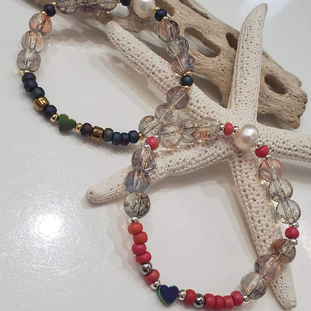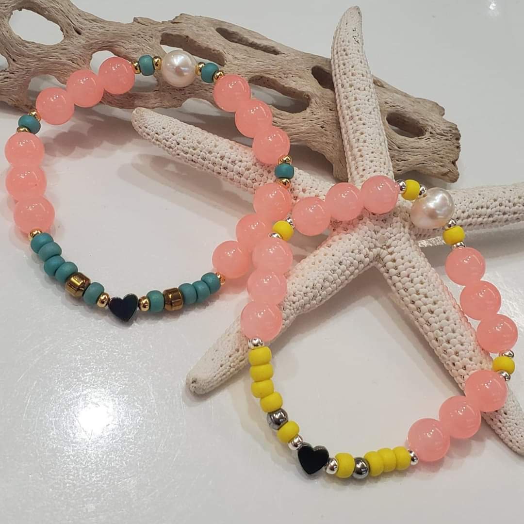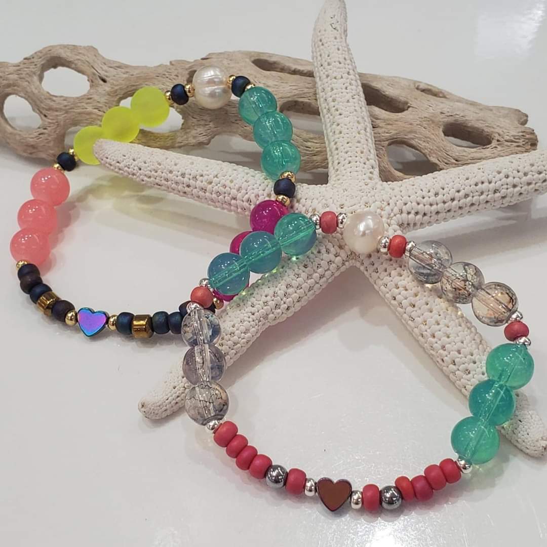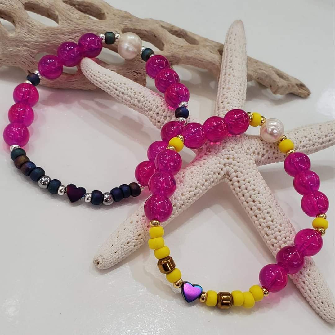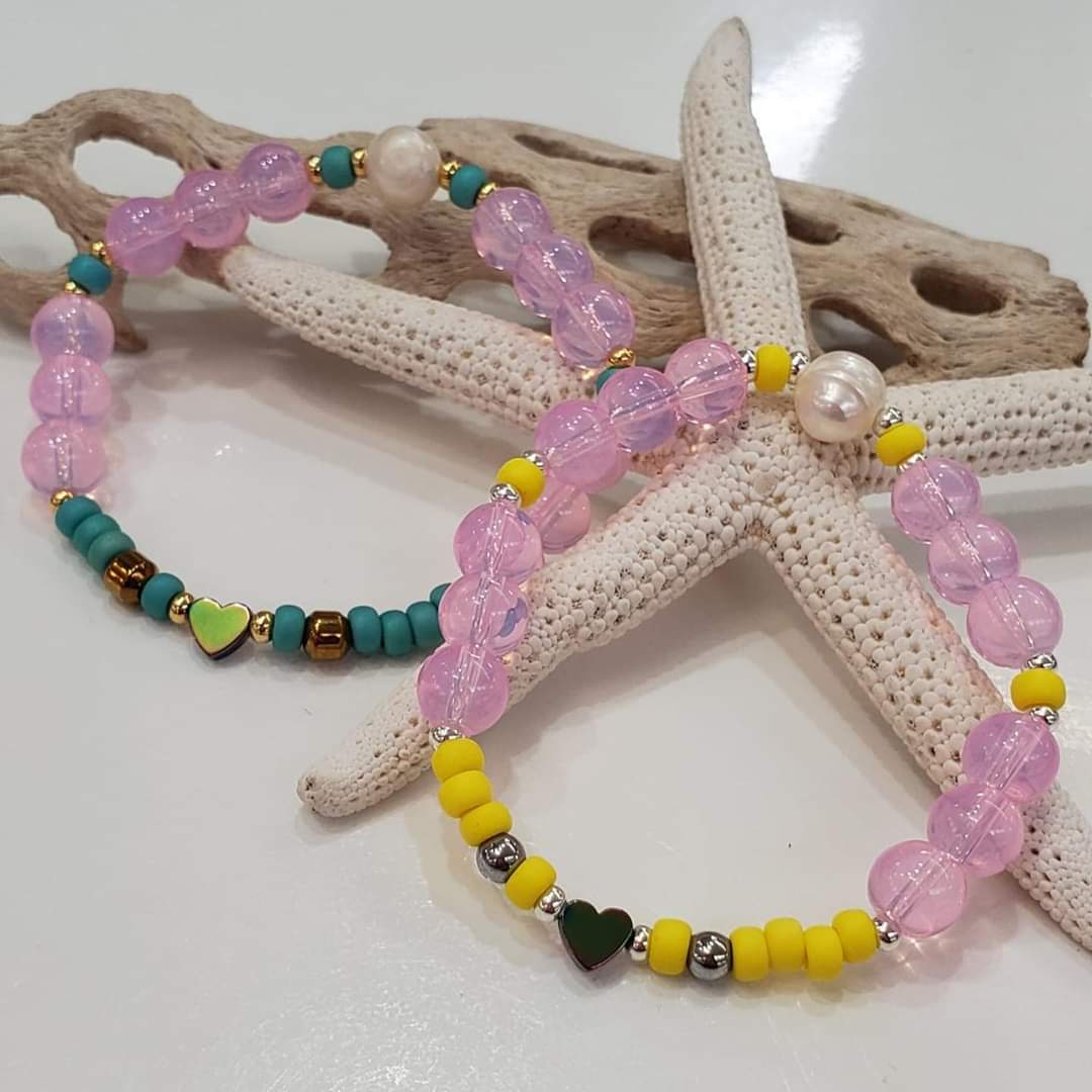 Preciosas pulseras elásticas confeccionadas a mano con cristales redondos. Estas piezas además llevan un charm en forma de corazón en cuarzo hematite colorful, una perla original de agua dulce y beads de varios colores como amarillos, tornasol, rojo ó turquesa. Sus detalles son en oro "goldfilled" y/o plateado "plated". Piezas resistentes al agua y sudor.