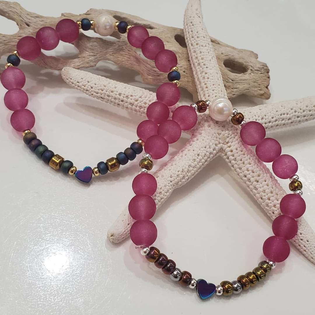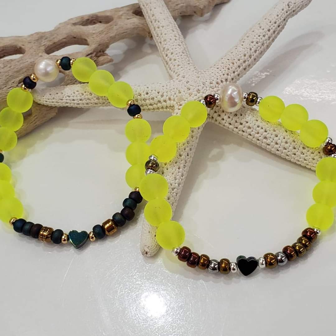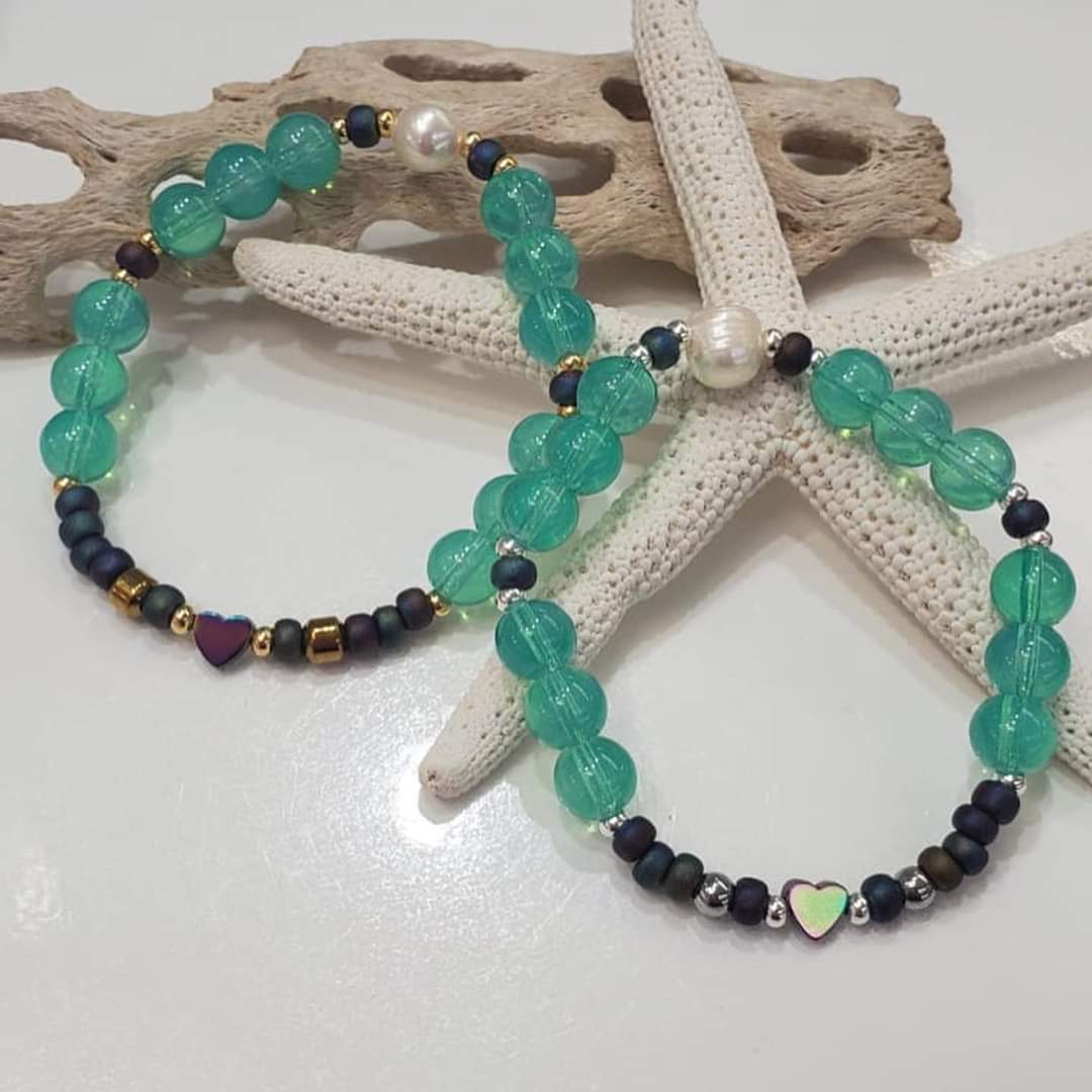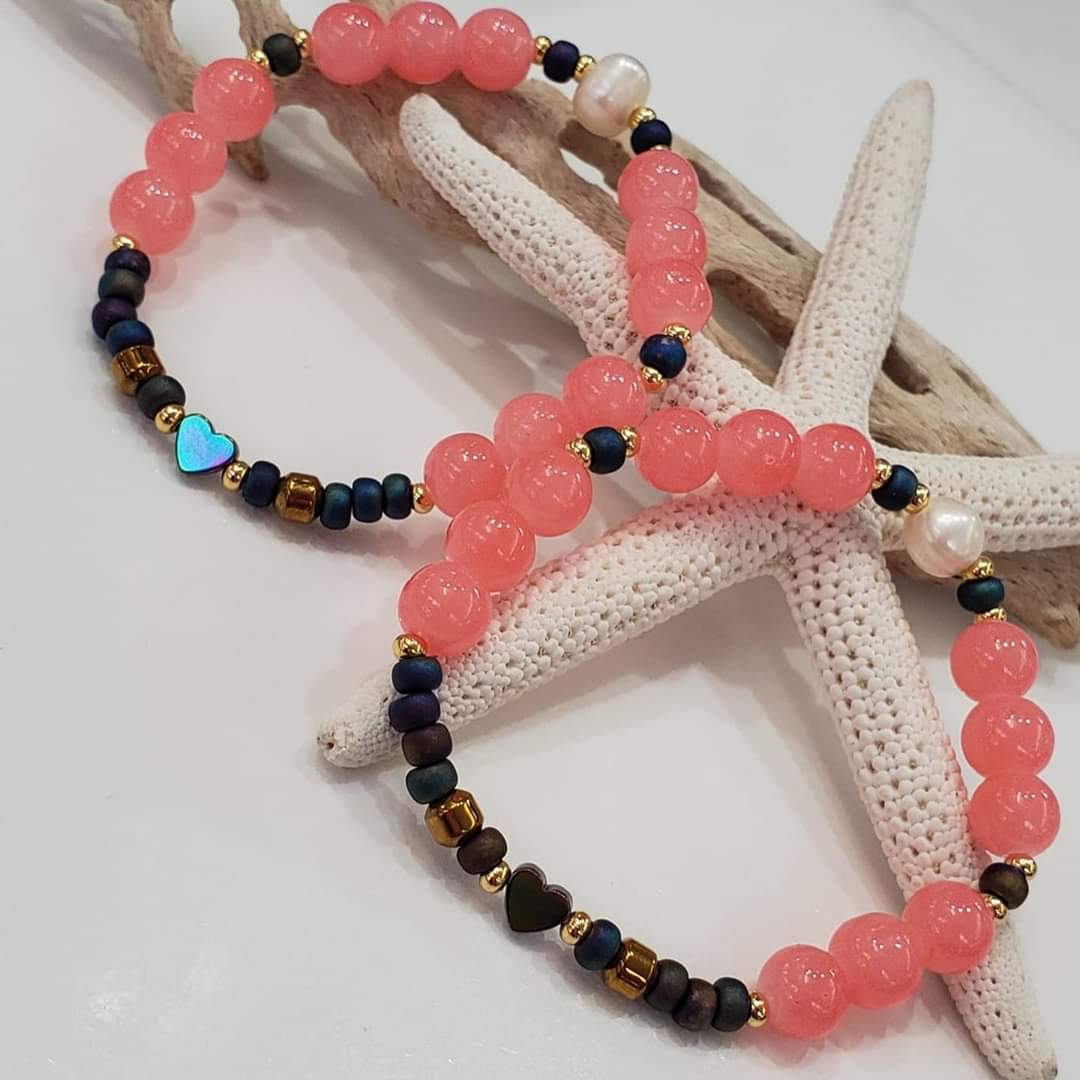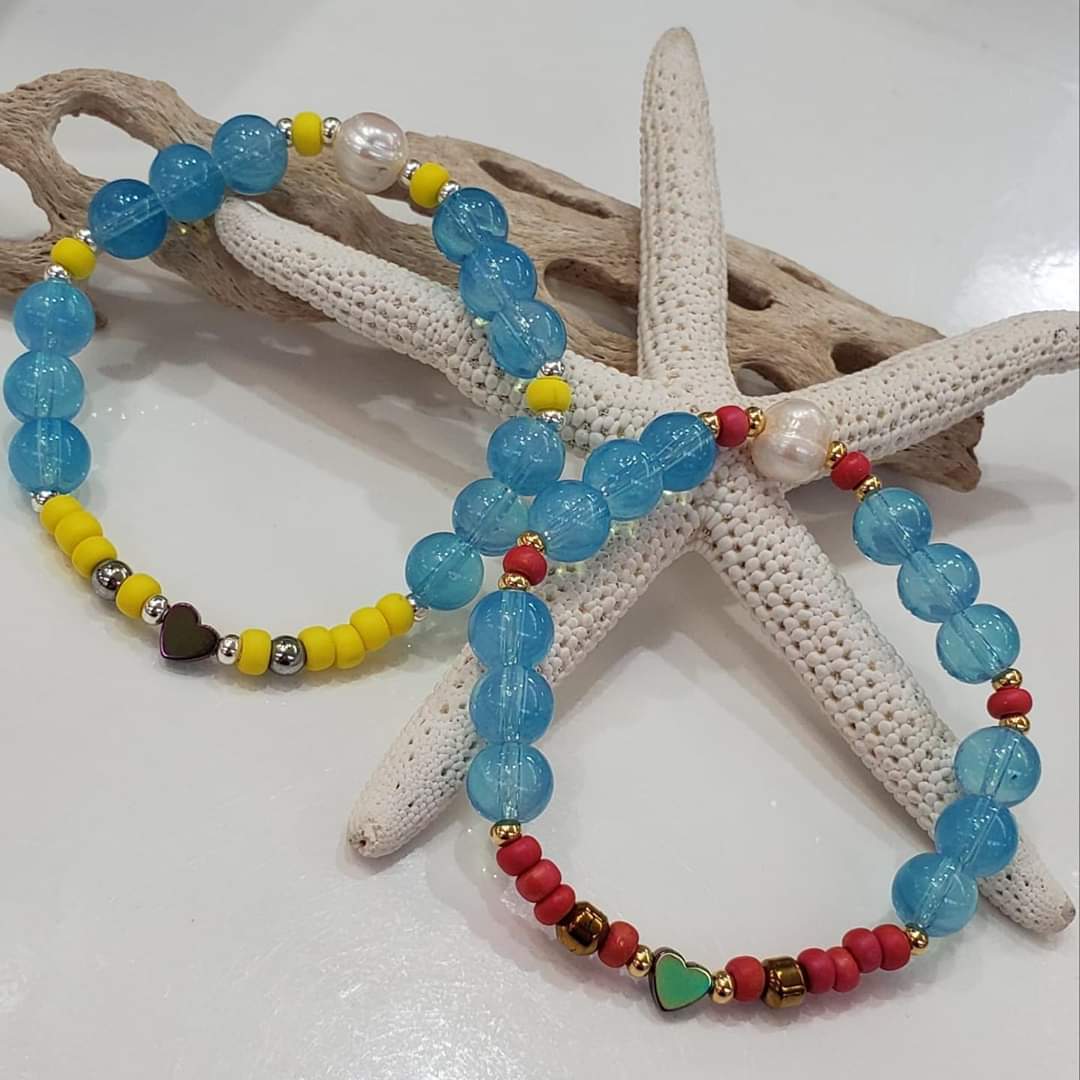 Preciosas pulseras elásticas confeccionadas a mano con cristales redondos. Estas piezas además llevan un charm en forma de corazón en cuarzo hematite colorful, una perla original de agua dulce y beads de varios colores como amarillos, tornasol, rojo ó turquesa. Sus detalles son en oro "goldfilled" y/o plateado "plated". Piezas resistentes al agua y sudor.