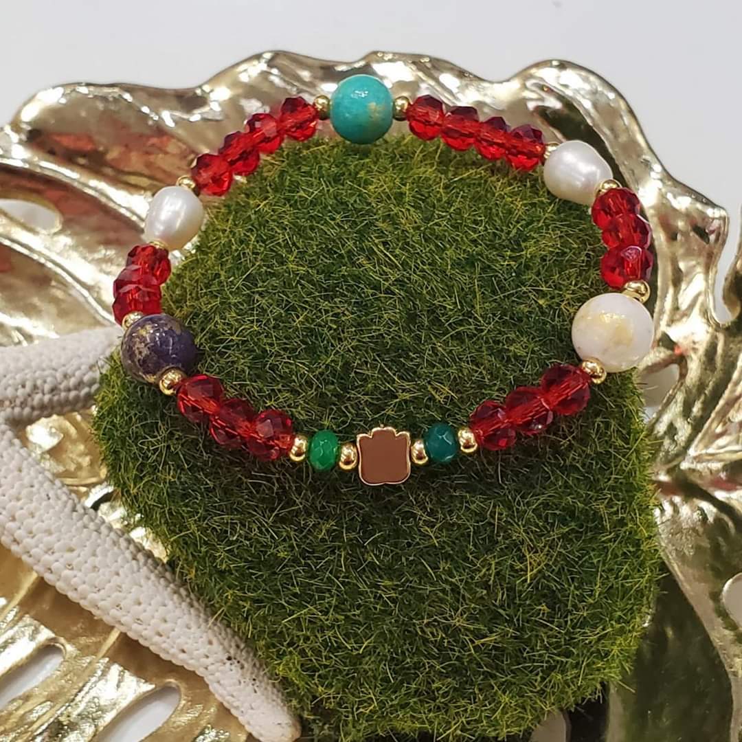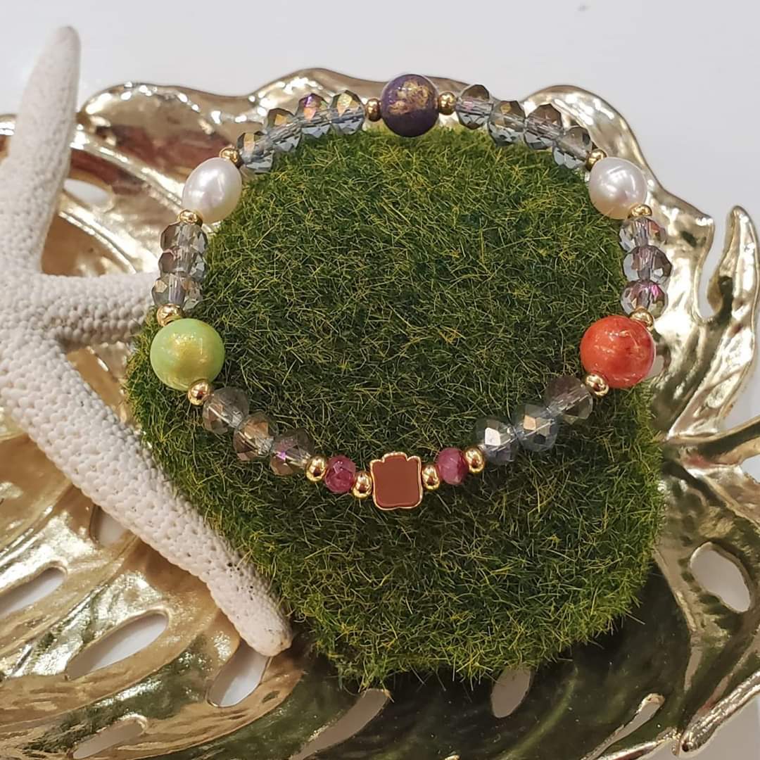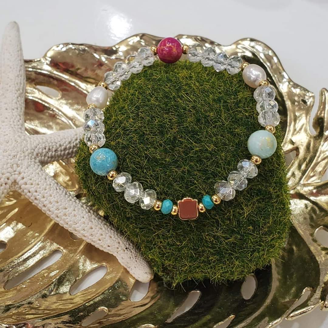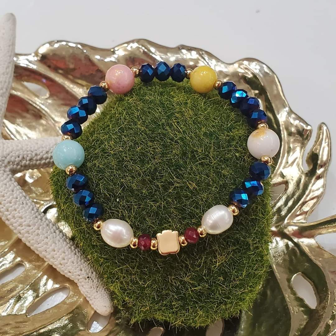 Hermosas pulseras elásticas confeccionadas en cristales. Está pieza además esta acompañada de perlas originales de agua dulce, cuarzos y  charm de un tulipán en cuarzo hematite. Sus detalles dorados son en "goldfilled". Resistentes al agua.
