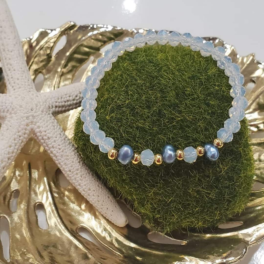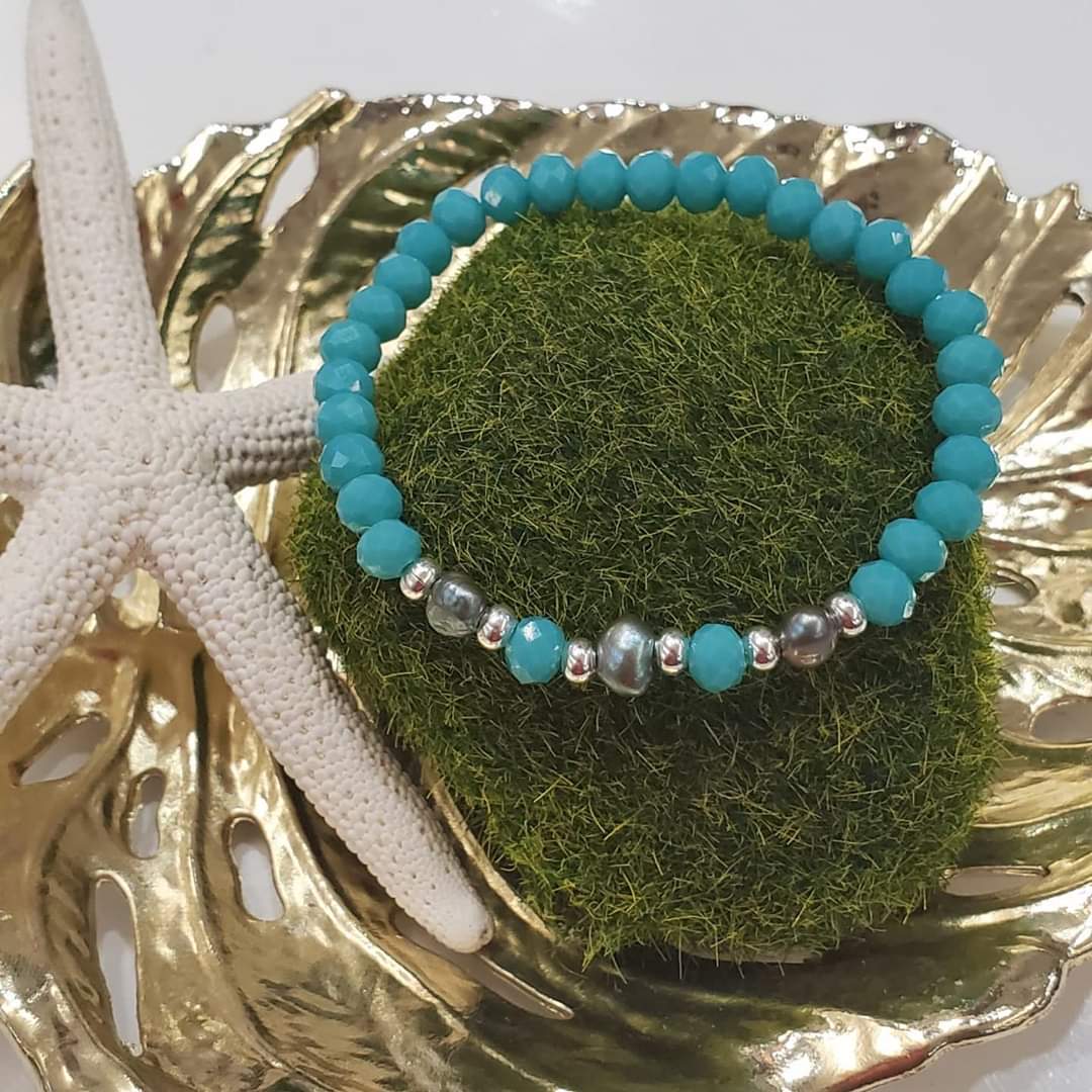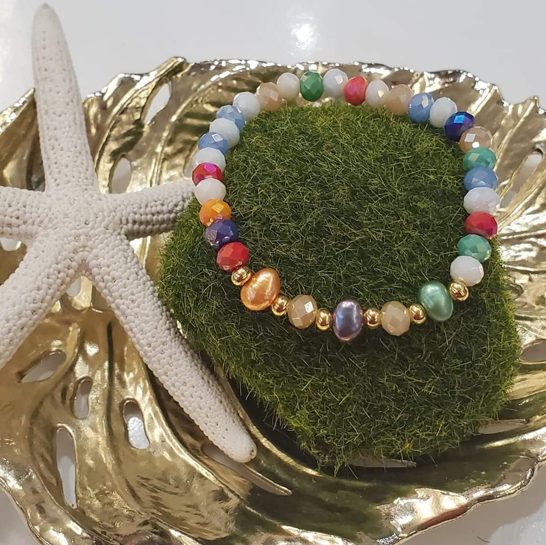 Hermosas pulseras elásticas confeccionadas en cristales y tres perlas originales de agua dulce. Los detalles de estas bellas piezas son en dorado "goldfilled" y/o plateado "plated".