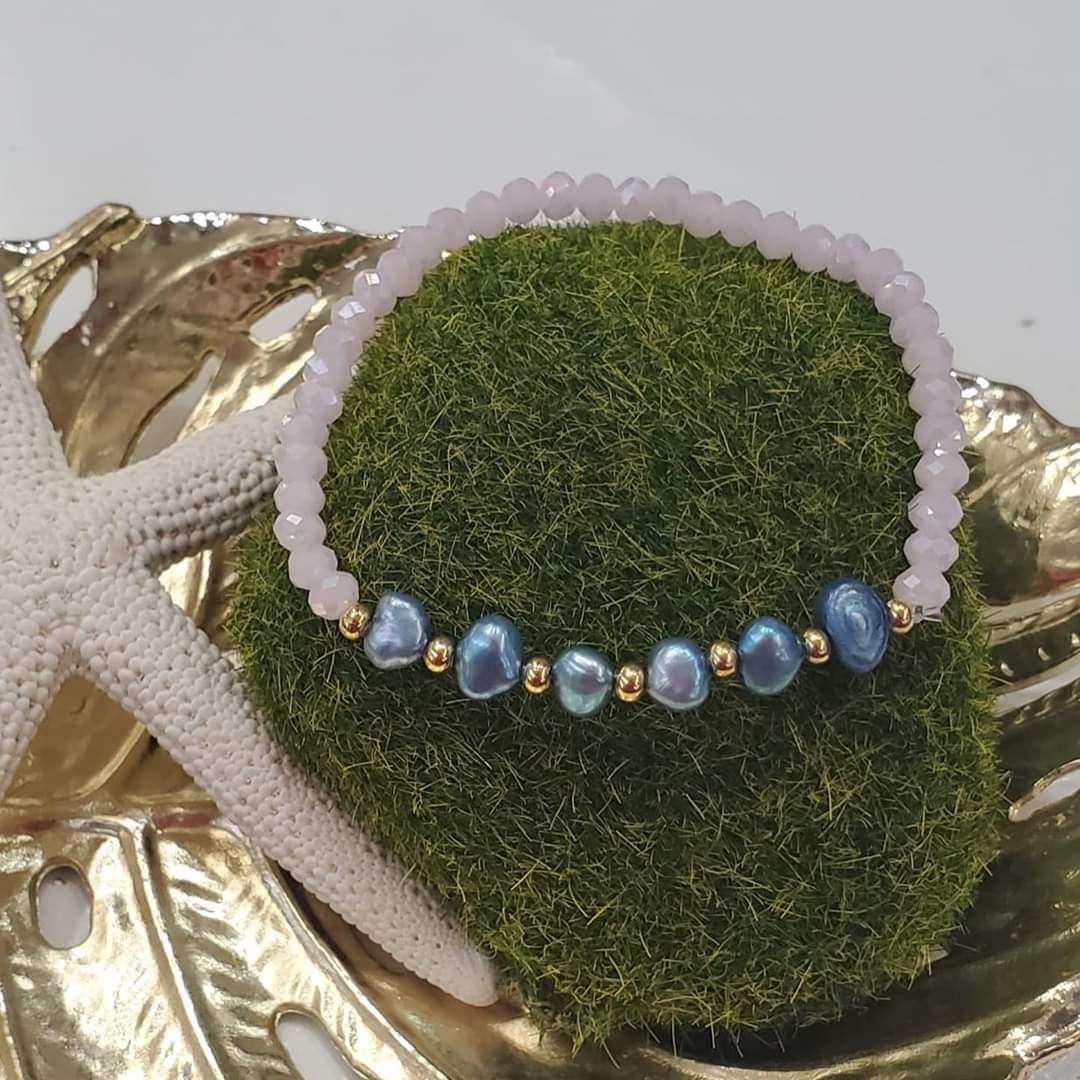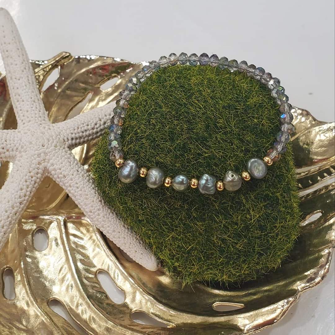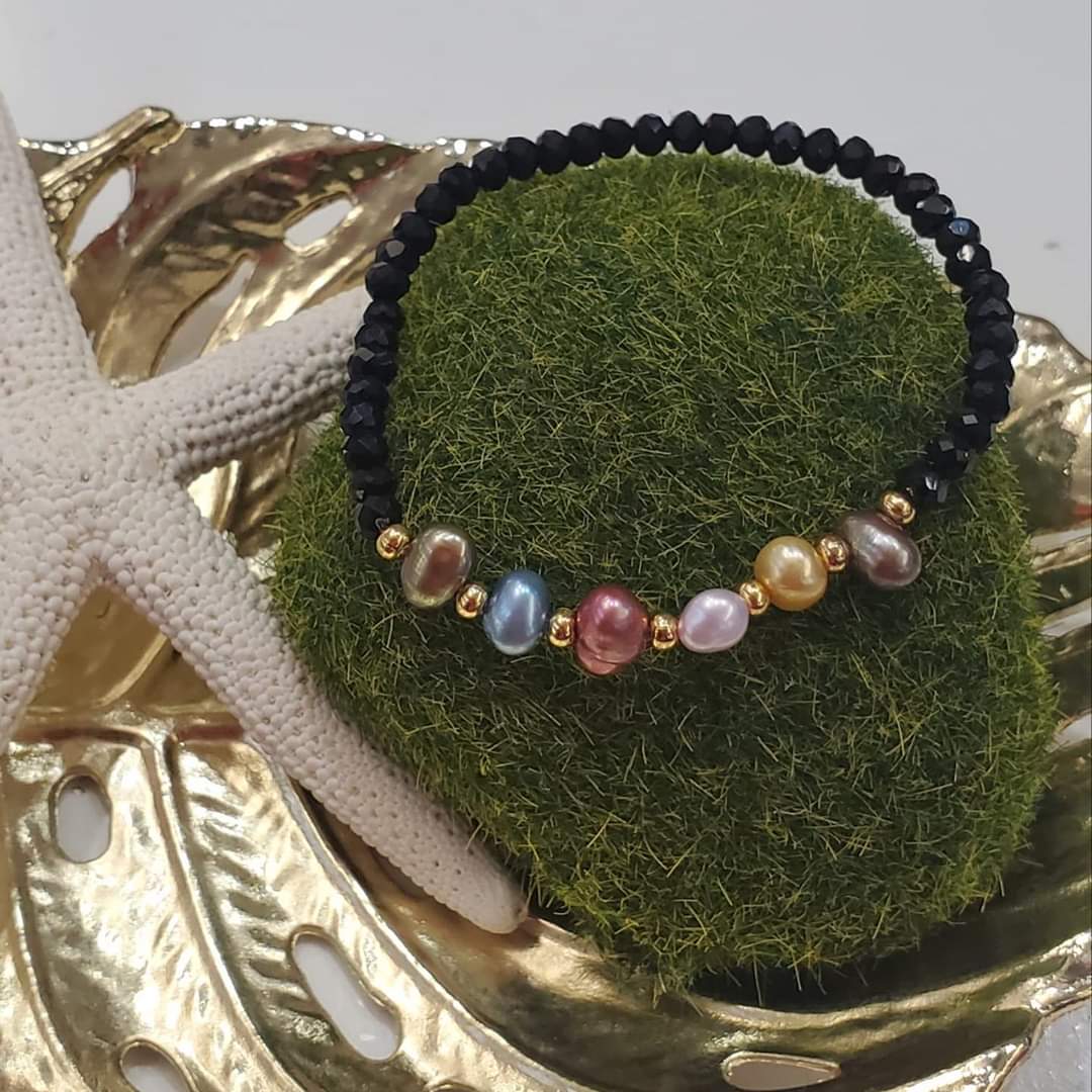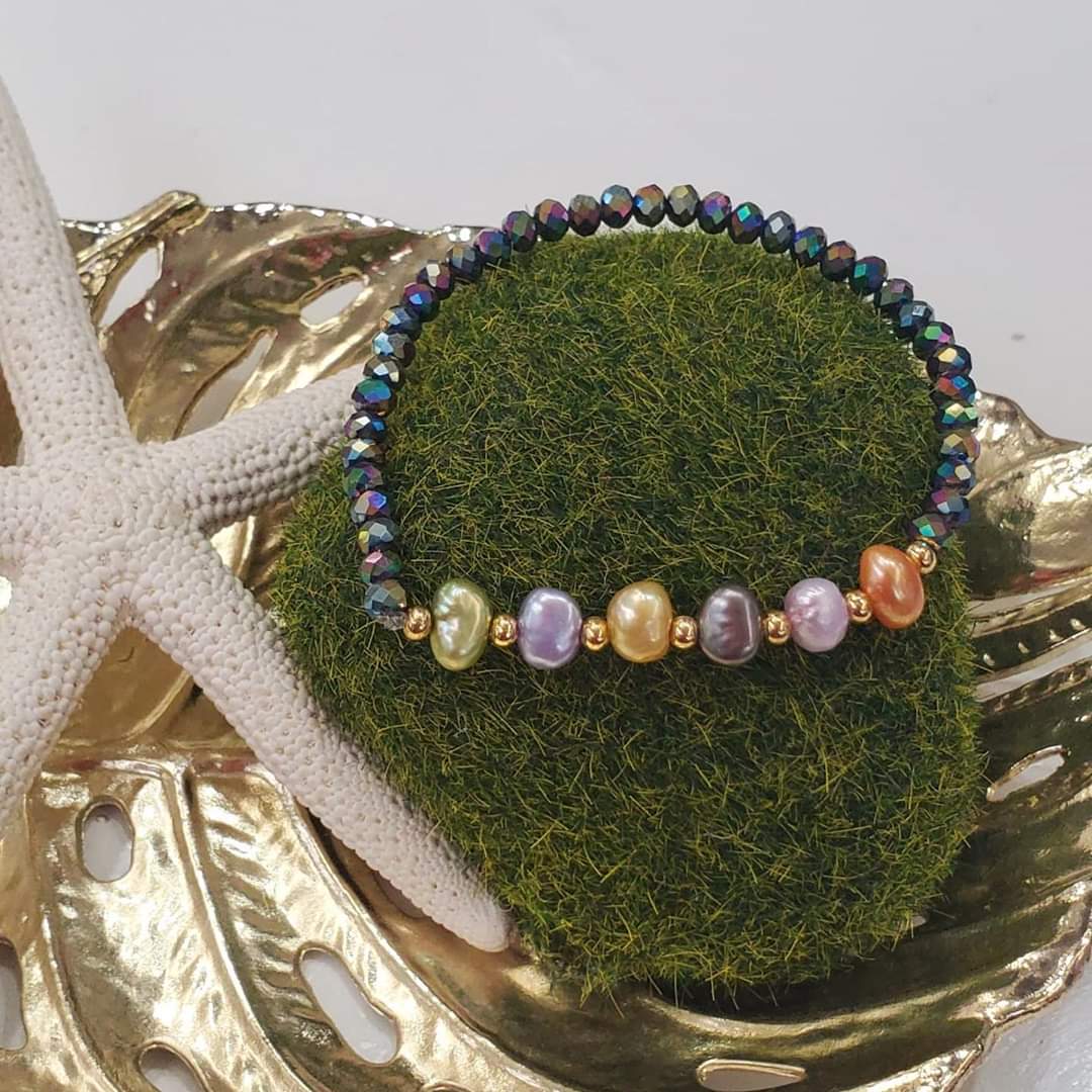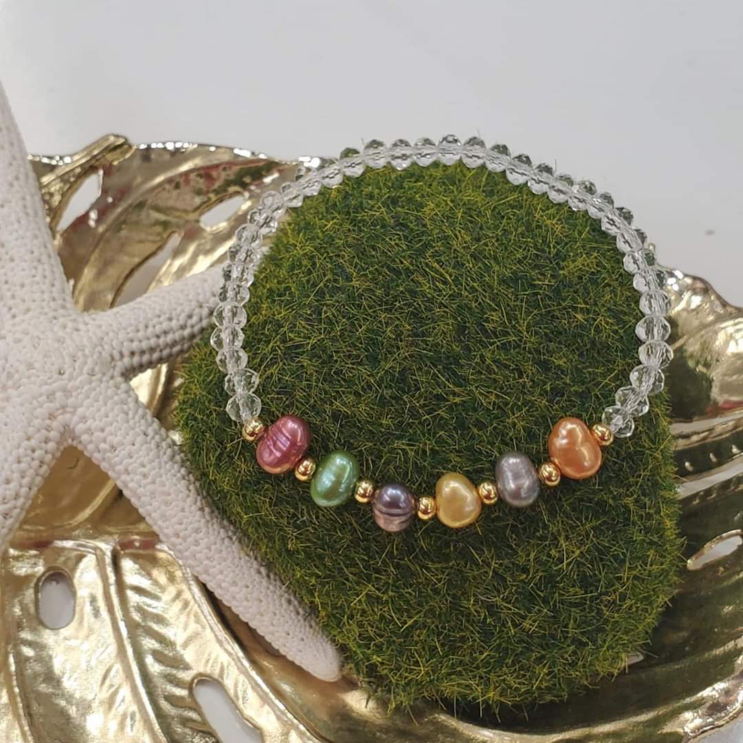 Bellas pulseras elásticas confeccionadas en cristales y seis perlas originales de agua dulce. Estas piezas son perfectas para acompañar y darle un toque de elegancia a tu outfit. Los detalles de estas bellas piezas son en dorado "goldfilled" y/o plateado "plated". Resistentes al agua.