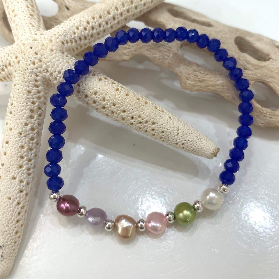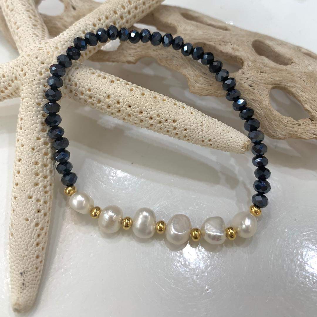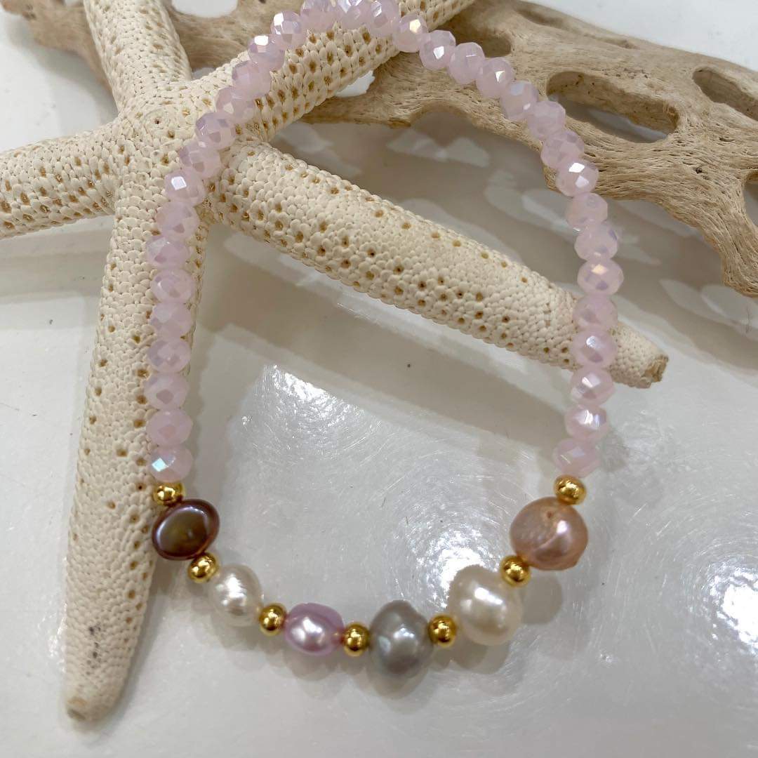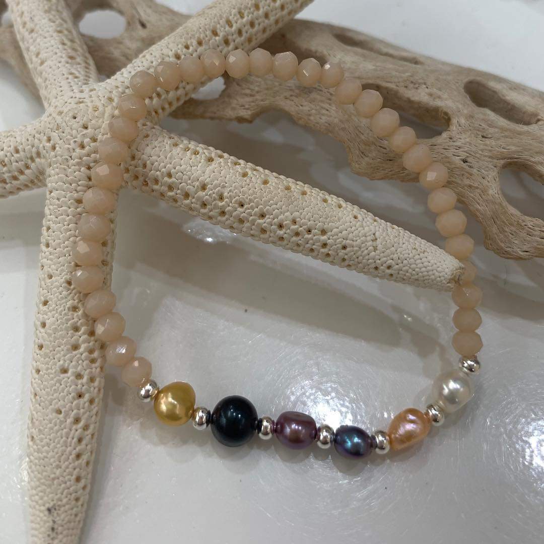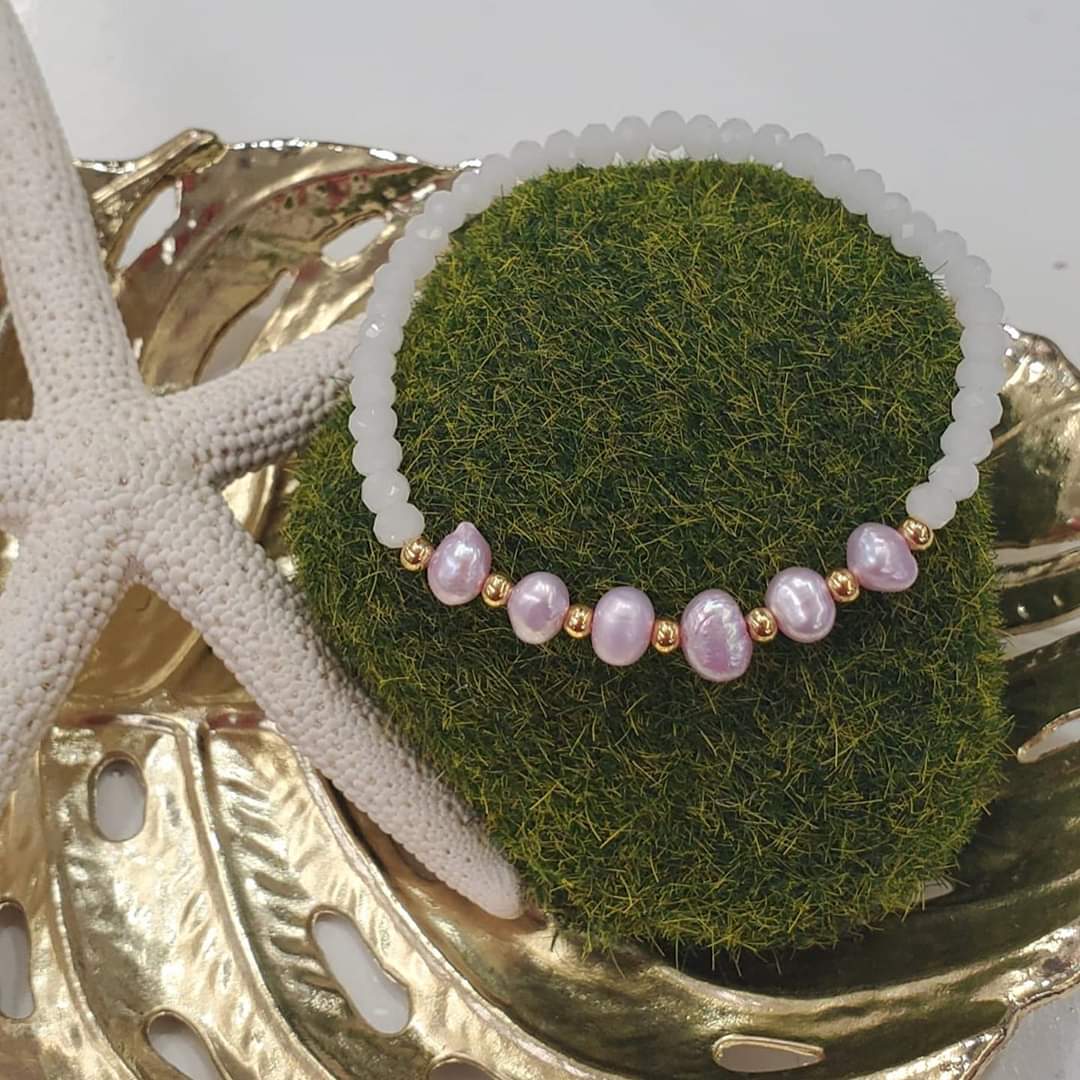Bellas pulseras elásticas confeccionadas en cristales y seis perlas originales de agua dulce. Estas piezas son perfectas para acompañar y darle un toque de elegancia a tu outfit. Los detalles de estas bellas piezas son en dorado "goldfilled" y/o plateado "plated". Resistentes al agua.
