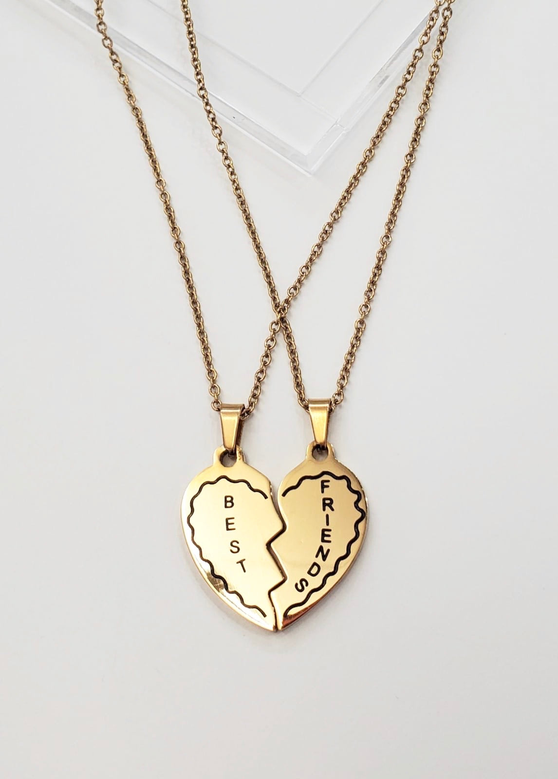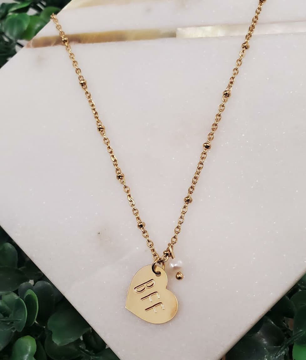 Excelentes cadenas a escoger que no se despinta, montada a mano con un charms en forma de corazón que esta partido a la mitad con el grabado de Best Friends. Otro estilo de cadena con un charms de corazón con el grabado de BFF acompañado con una perla original de agua dulce. Las cadenas tiene un tamaño de 20" pulgadas de largo, son en stainless steel dorado y plateadas.
