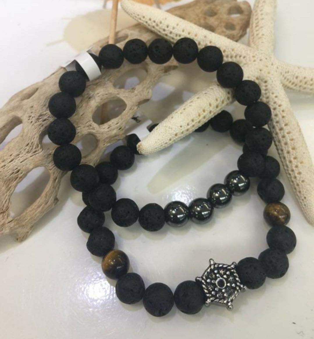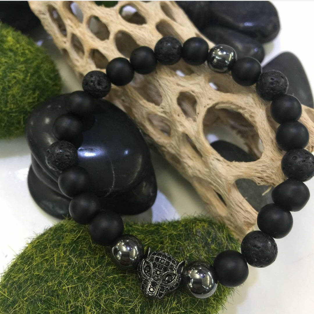 Pulseras confeccionadas a mano en elástico con cuarzos onix, lava volcánica, ojo de tigre y/o hematite. Además estas piezas incluyen un charm en stainless steel en forma de un timón ó de una pantera negra (zirconia). Medida plus 17 cm de caballero.Perfectas para uso diario ó combinar y darle un toque de elegancia a su estilo. Resistentes al agua, perfume y sudor..